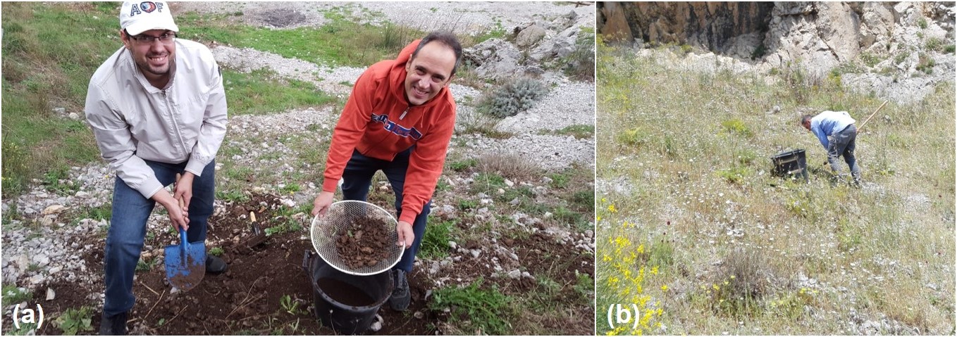 Figure 1. Soil collection at the two sites location. (a) Dr. Luca Arrigo and Pr. Giovanni Scopece collecting limestone soil in Valico di Chiunze (40.719°N, 14.619°E). (b) Pr. Giovanni Scopece collecting tuff soil in Monte di Procida.