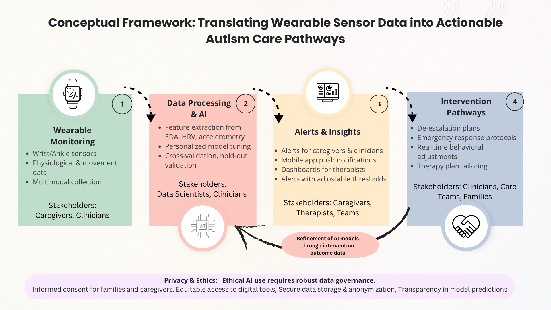 Below is the conceptual framework we developed to illustrate how AI-enabled wrist and ankle wearables could translate sensor data into actionable autism care pathways.