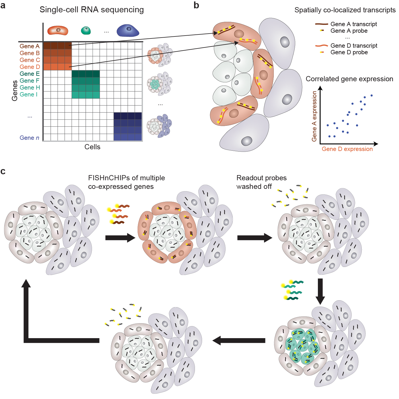 FISHnCHIPs introduces a strategic approach in designing the gene panel. The process begins by analyzing single-cell RNA sequencing (scRNA-seq) data to identify groups of highly correlated genes, known as gene modules or expression programs (Figure 1a). These gene modules act as molecular signatures for specific cell types or cellular states, which also provides a comprehensive view of gene expression pattern across different cell types. Those co-expressed genes are not only correlated in their expression level, but also spatially colocalized within the tissue (Figure 1b). This colocalization allows us to design a pool of fluorescently labeled oligonucleotide probes to target the transcripts of these co-expressed genes in repeated rounds of hybridization and washing (Figure 1c). Importantly, because multiple co-expressed genes are targeted simultaneously, the resulting signal is amplified and can be detected under a microscope with low magnification.