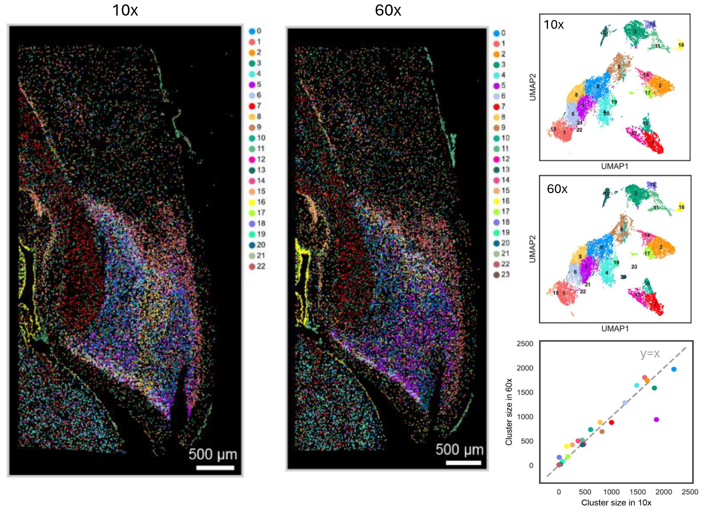 Encouraged by these results, we harnessed the high-throughput capabilities of FISHnCHIPs to profile 53 gene modules across a whole sagittal section of the mouse brain. The profiling for this large field of view using a 10x objective lens was completed in only 21 hours – a task that would typically take almost a week for ~700 genes under a 60x objective. Remarkably, despite the lower magnification, FISHnCHIPs enabled reliable detection and clustering of cells, where the cluster sizes of 10x and 60x imaging in adjacent sections were highly correlated (Figure 2). It suggested that there was no observable degradation of data quality despite the lower magnification and higher throughput.