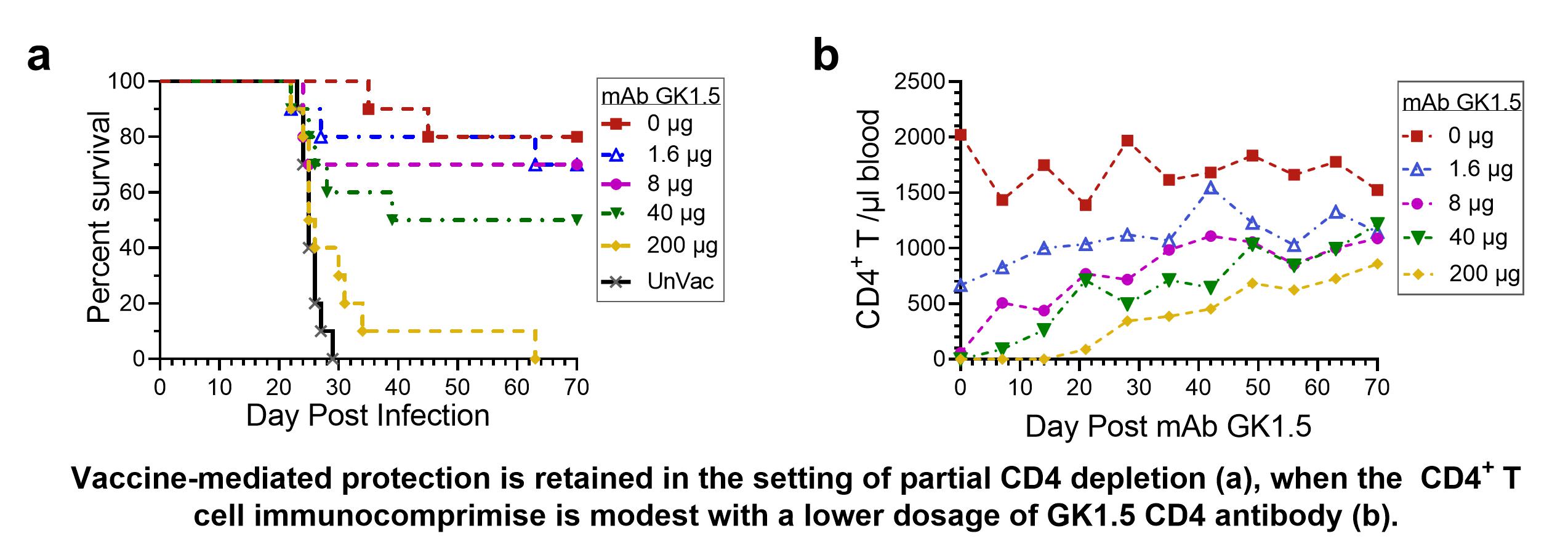 While B cells and CD8+ T cells were not required, two lines of evidence demonstrate the non-redundant contribution that CD4+ T cells make to GP-vaccine mediated protection. First, vaccination with GP-Cda1 and GP-Cda2 failed to protect CD4+ T cell-deficient MHCII-/- mice against cryptococcal challenge. Second, vaccine-mediated protection was lost when mice were depleted of CD4+ T cells using a monoclonal antibody targeting CD4. Notably, protection was abrogated regardless of whether the CD4+ T cells were depleted at the time of vaccination or during infection. These findings raise the question of whether the immunocompromised populations most at risk for cryptococcosis could still benefit from the vaccine. Taking into consideration that most immunocompromised individuals are only partially deficient in CD4+ T cell number or function, we established a partial CD4 deletion animal model using a range of doses of the anti-CD4 mAb, GK1.5. The protection elicited by the GP-Cda1/Cda2 combination vaccine was inversely correlated with GK1.5 dosage. Importantly, mice with very low levels of blood CD4+ T cells at the time of challenge were protected. While the translational significance of these findings remains speculative, these data suggest it may be possible to vaccinate persons living with HIV while their CD4+ T cells counts are relatively high, either at early diagnosis or after antiretroviral treatment.