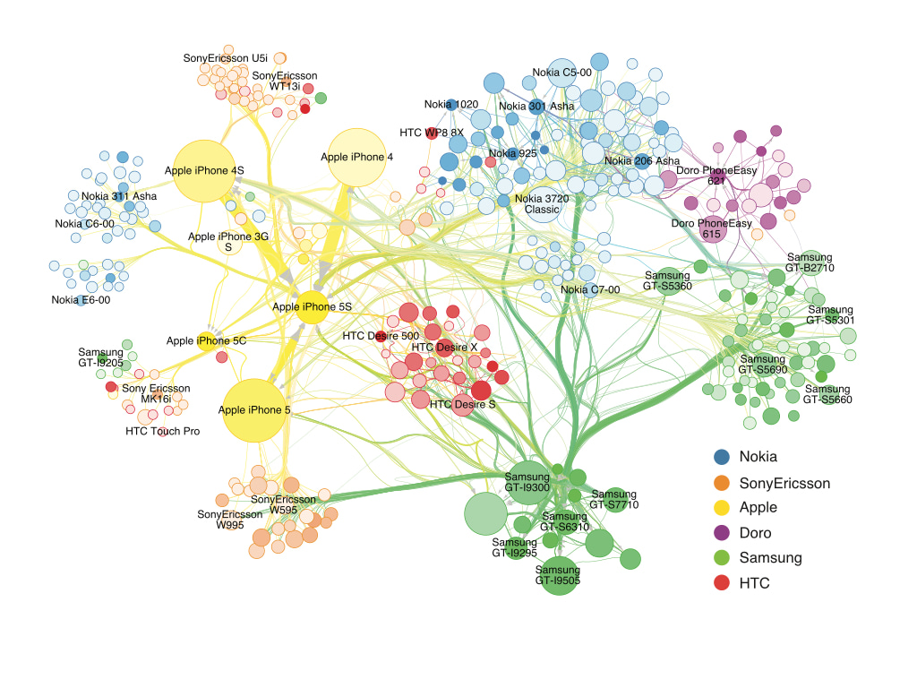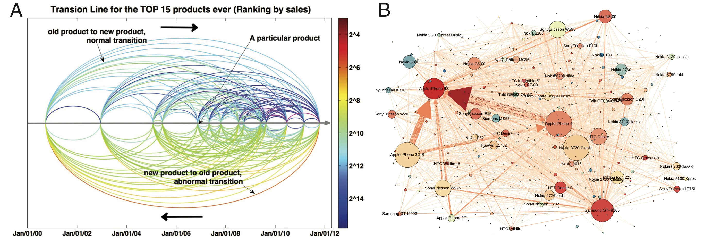 Back then, though, the concept was still sort of fuzzy. To try to pin it down, I drew a sketch based on the transition data from 15 handsets (Fig. 1A, which we also called the “egg plot”). As I see it today, it’s a rather naive and simple plot, but it helped us identify some trends in the data that we hadn’t focused on before. When we showed the figure to Chaoming, we were surprised to realize that he, too, had been thinking about the substitution process as it related to the data. He even proposed several potential mechanisms for the process, some of which proved to be impressively accurate when I tested them in the real data later. As the new substitution mechanisms (preferential attachment, recency, and propensity) were sequentially discovered, we began to incorporate them into our visualizations (I picked a couple of them in Fig. 1B and Fig. 2), which leads to the final network in our paper (Fig. 3, here we especially want to thank Prof. A-L. Barabási, from whom we got several valuable comments and great inspirations during this process). The discovered mechanisms not only push the "substitution" of the "network visualization", but also provide a link between individual-level behaviours and the macroscopic framework we built years ago, highlighting a unique early growth pattern of impact dynamics in the studied system that follows a power law.