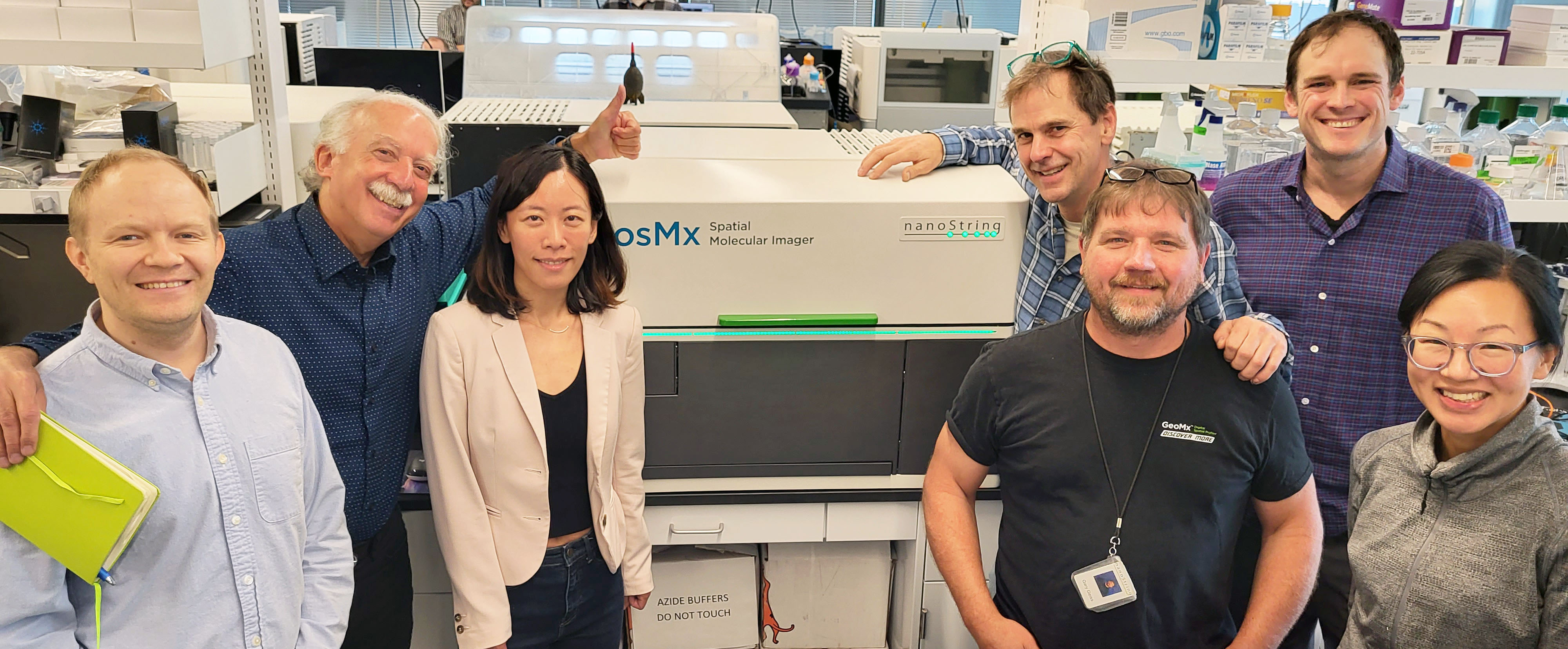 Margaret was originally hired for the Hyb & Seq program. She said, “I was called Spot 2”, meaning that she worked on the project to establish the second 14-base-pair sequence for reporter hybridization. Her team called the overall reporter structure, an “exploding Christmas tree” because of the structure connected with photocleavable linkers. At the time, there were a lot of activities going on in the development of both GeoMx and nCounter platforms; especially, we were increasing the RNA-plex number in GeoMx by sequencing the barcodes for readout. In 2019, Margaret’s team launched the GeoMx Cancer Transcriptome Atlas which was designed to profile over 1,800 RNA targets in-situ. This led to the release of the commercial product GeoMx Whole Transcriptome Atlas in 2021, which utilized as many as 22,000 in-situ hybridization probes with an NGS readout. For the development of the CosMx SMI, we could use all the knowledge acquired for the GeoMx DSP development to fast-track debugging our high-plex imaging assays.