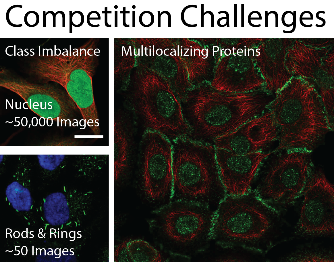 The HPA Protein Atlas Image Classification sought to tackle two main challenges. First, the localization patterns have vastly different frequencies; the most common, Nucleus, and rarest, Rods & Rings, are illustrated here. Second, the participants’ models needed to classify up to 6 localization patterns for each protein to account for multilocalizing proteins.