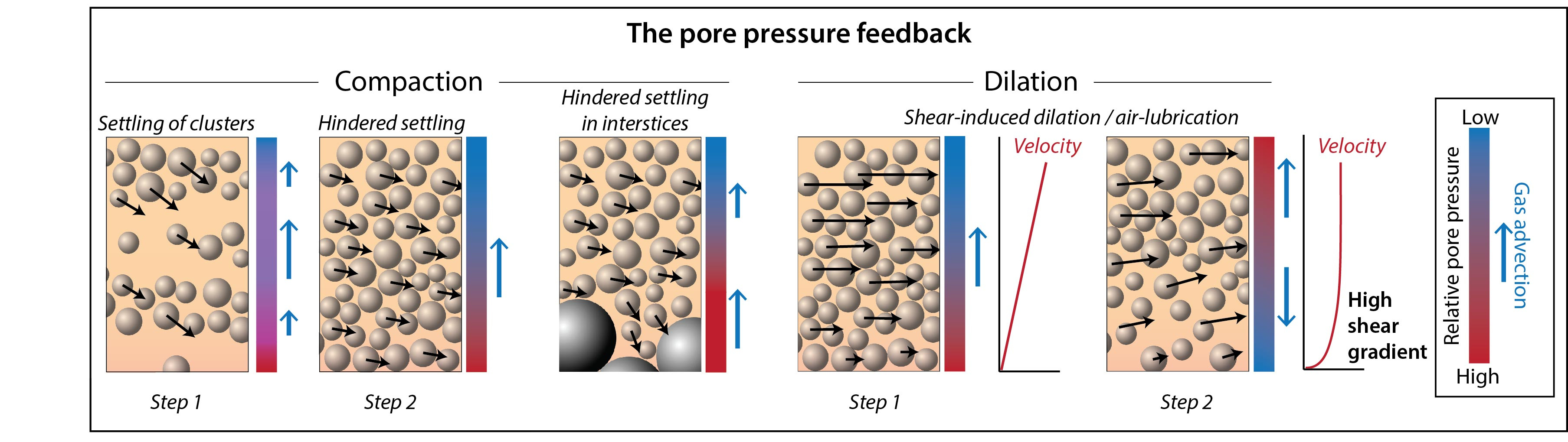 Enter fluidisation: a process in which a fluid flows through a porous granular medium in a direction opposing gravity, reducing both normal stress and subsequently effective shear stress, and ultimately diminishing the effective friction. Fluidisation is widely used in industry to facilitate chemical reactions, heat transfer, and the transportation of granular materials by forcing an external fluid flow through a granular bed. However, in most cases, such external fluid flow is not expected to occur in pyroclastic density currents (PDCs). Instead, the creation of excess pore-fluid pressure (fluidisation) and its diffusion (defluidisation) can result from the compaction of the mixture, a phenomenon known as pore pressure feedback.
