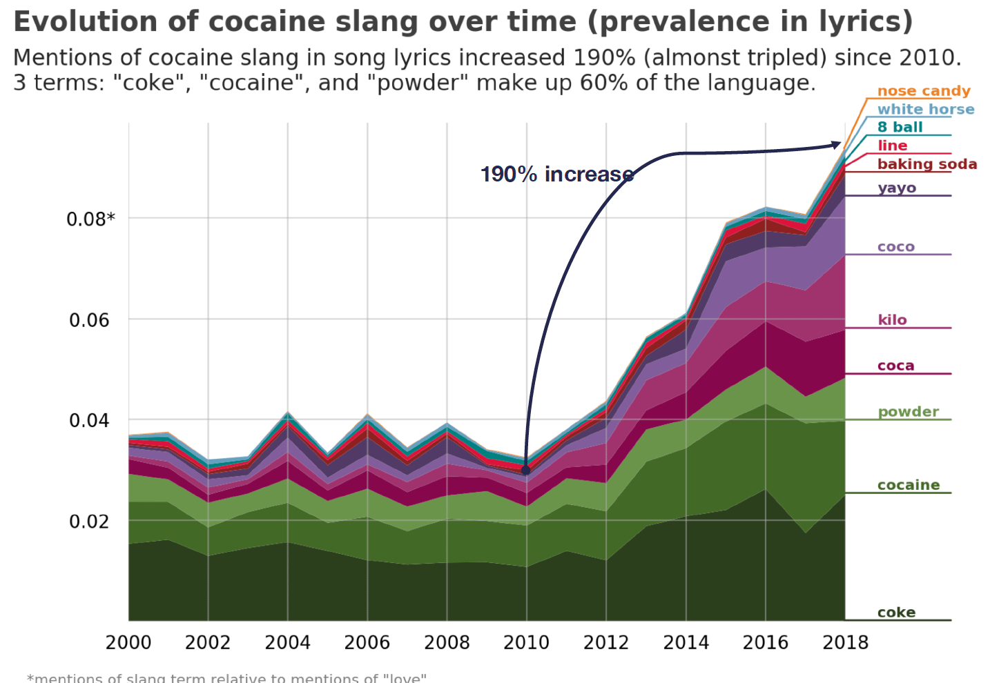 Mitchell: I’ll start with one personal observation. Drugs are used for three reasons: to escape reality, to find a way to COPE with reality, and to have fun and party. Over time, artists have infused drug usage as an enhancement in their work, to become “super-artist.” This happens in all forms of media, as I’ve also talked to authors who have used drugs to see the world differently. It doesn’t just happen with cocaine, but drugs such as Tylenol can change one’s interpretation of the pain they feel. In terms of music and its effect on society, the study is absolutely correct.