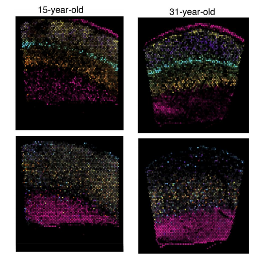 Image 2: A snap shot of brain tissue sections from a 15-year-old and 31-year-old showing an array of cell types indicated by different colours. We see a very similar composition of cell types despite the tissue coming from individuals who are more than 15 years apart. Although the architecture of the paediatric and adult brain appears similar, we were interested in whether there are underlying differences in gene expression between paediatric and adult cell types. Images were obtained using Visium spatial transcriptomics.