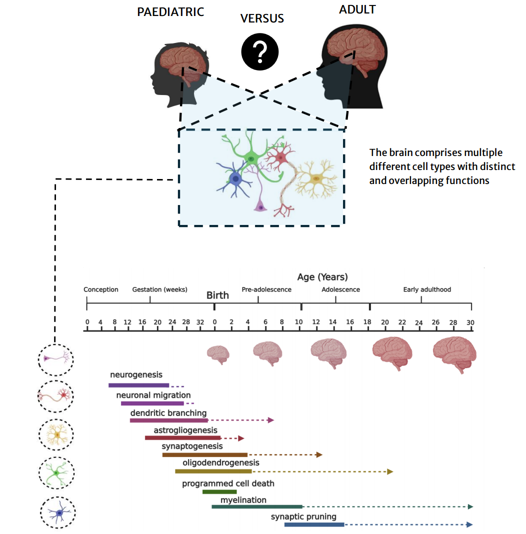 Image 1: The human brain is a work-in-progress and continues to develop from birth into early adulthood. Multiple cell types and cell subtypes exist in the brain and are involved in a variety of processes such as synaptic pruning and myelination. We are interested in comparing gene expression profiles between paediatric and adult brains within individual cell types instead of looking across multiple cell types. This close-up examination will enhance our understanding of mechanisms of brain maturation that are specific to certain cell types and shared across different cell types. This may contribute towards developing targeted therapies for treating neurological diseases that also account for the age of the patient. Adapted from Silbereis et al.(2016).