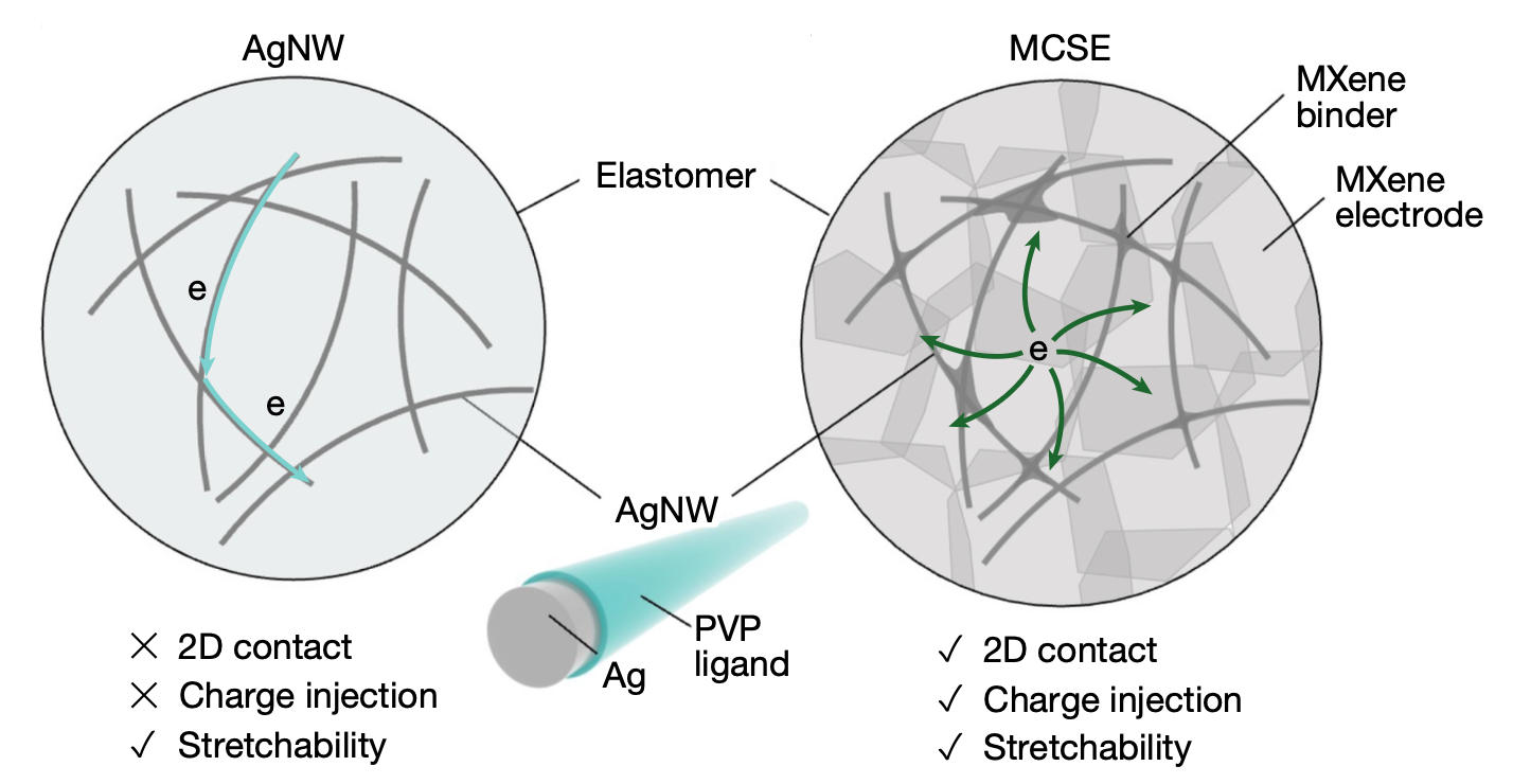 Our solution was the development of MXene Contact Stretchable Electrodes (MCSEs). MXenes are a class of two-dimensional transition metal carbides that are highly conductive, hydrophilic, and mechanically robust. We realized that by "welding" AgNWs with MXenes (specifically Ti₃C₂Tₓ), we could create a synergistic network (Figure 2).