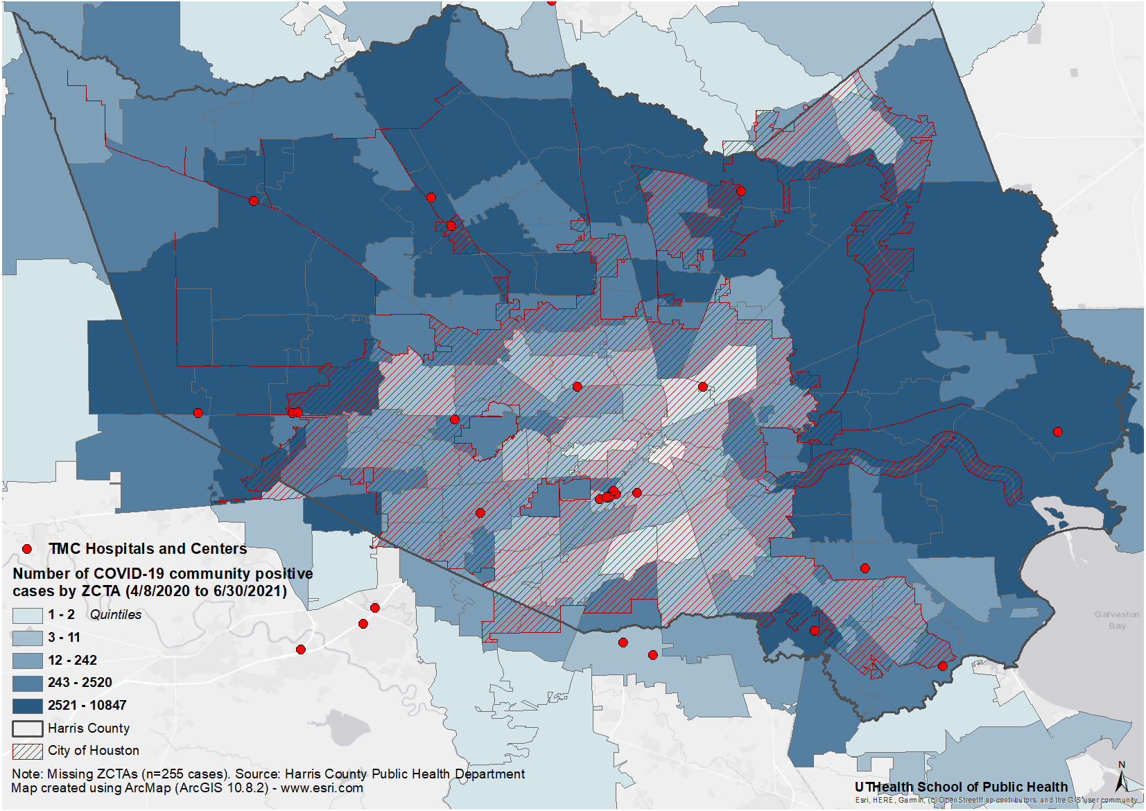 Figure 1. Distribution of cumulative SARS-CoV-2 infections across ZIP Code Tabulation Areas in Harris County, Texas, from April 8, 2020 to June 30, 2021