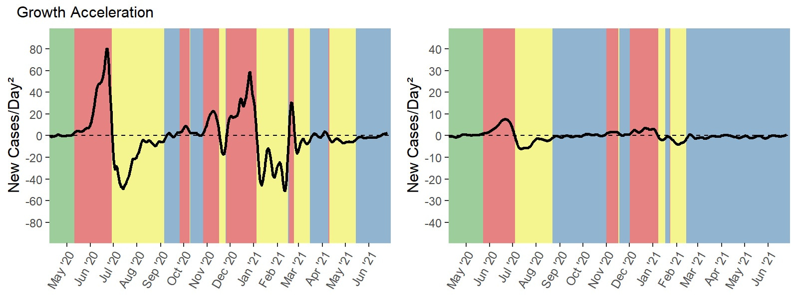 Figure 2. SARS-CoV-2 growth acceleration and stage among Harris County residents (left) and a subgroup of residents admitted to Texas Medical Center hospitals with a positive SARS-CoV-2 test (right) from April 8, 2020 to June 30, 2021.