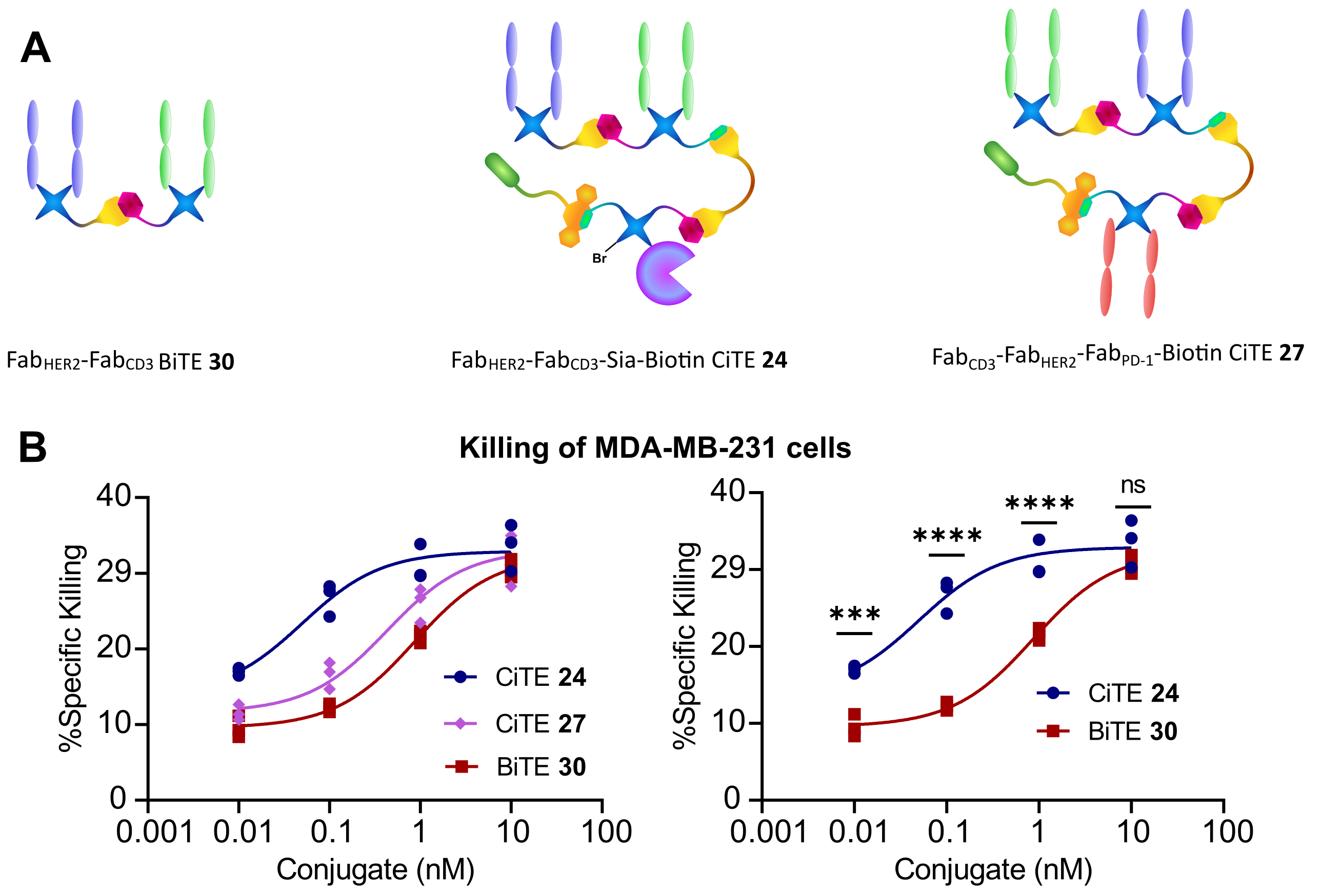 The CiTEs were then compared to the BiTE in a co-culture assay between HER2+ MDA-MB231 cells and human T cells in vitro. It was found that both CiTEs showed significantly enhanced cytotoxicity over the BiTE, with the sialidase enzyme-containing CiTE 24 being especially potent.