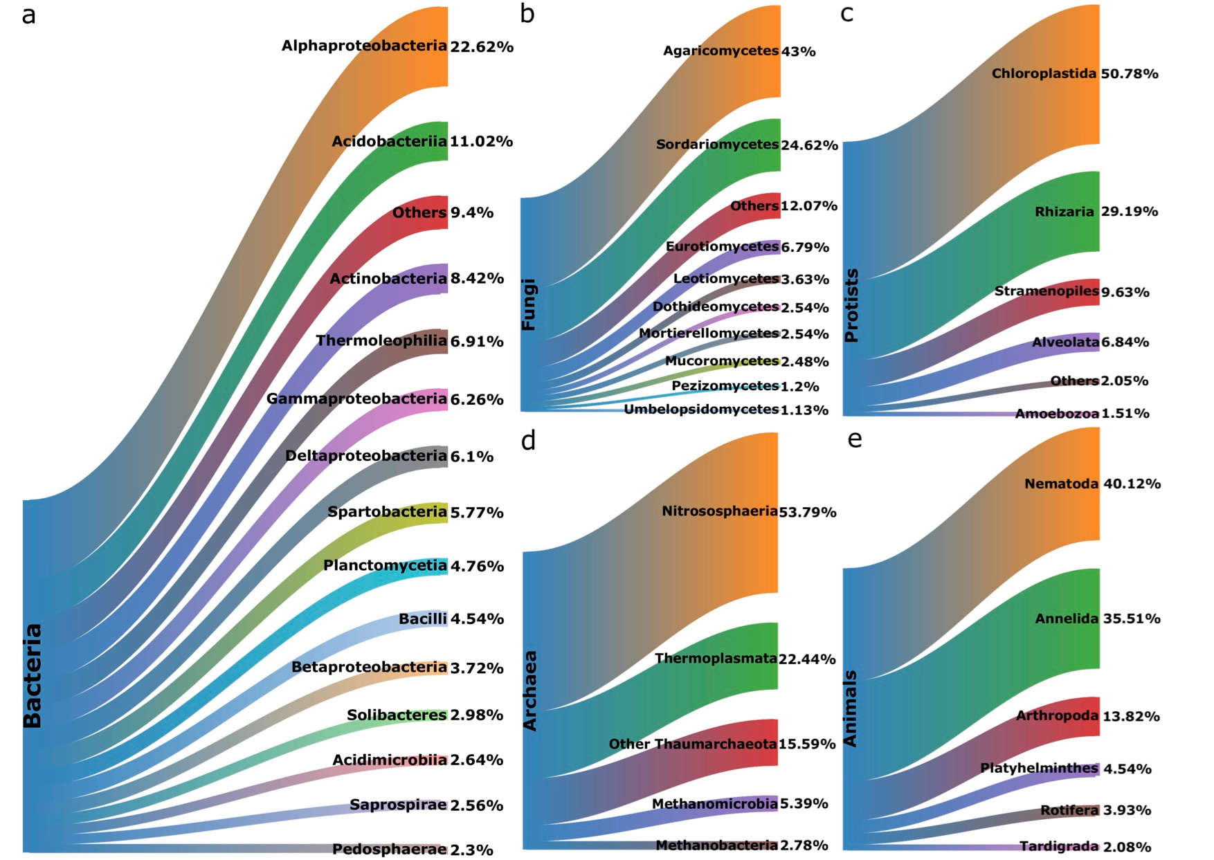 Fig 4. Richness of soil a bacteria; b fungi; c protists; d archaea; e animals across land use ordered from most (crops/weeds) to least (heath/bog).