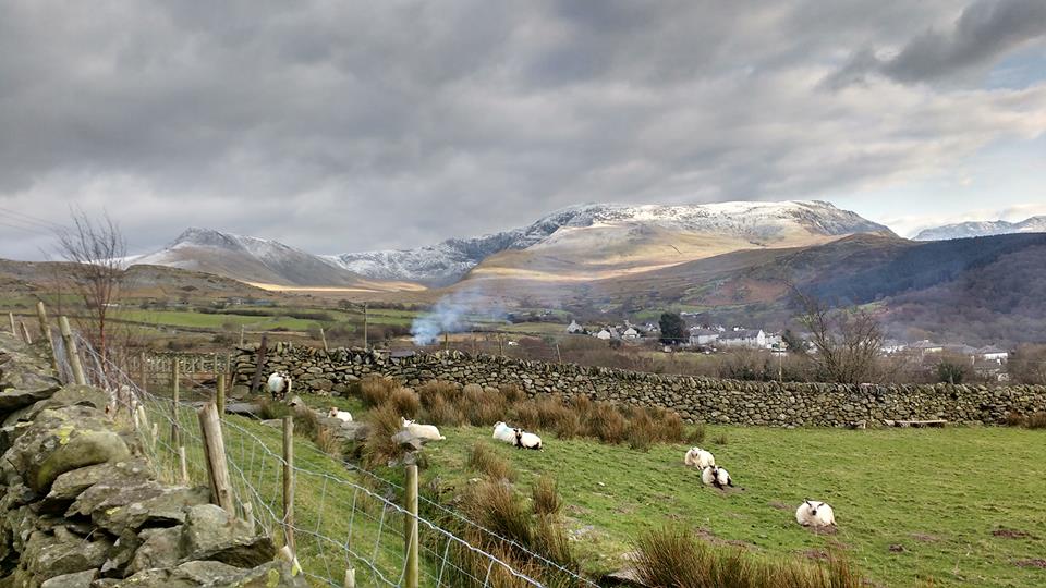 Fig 3. This photo taken near Bethesda, highlights the diversity of land uses typical of Wales. In the foreground, sheep graze and open grasslands stretch to the hills. Behind the village, plantations of both coniferous and deciduous trees can be seen. In the background are the mountains of Snowdonia.