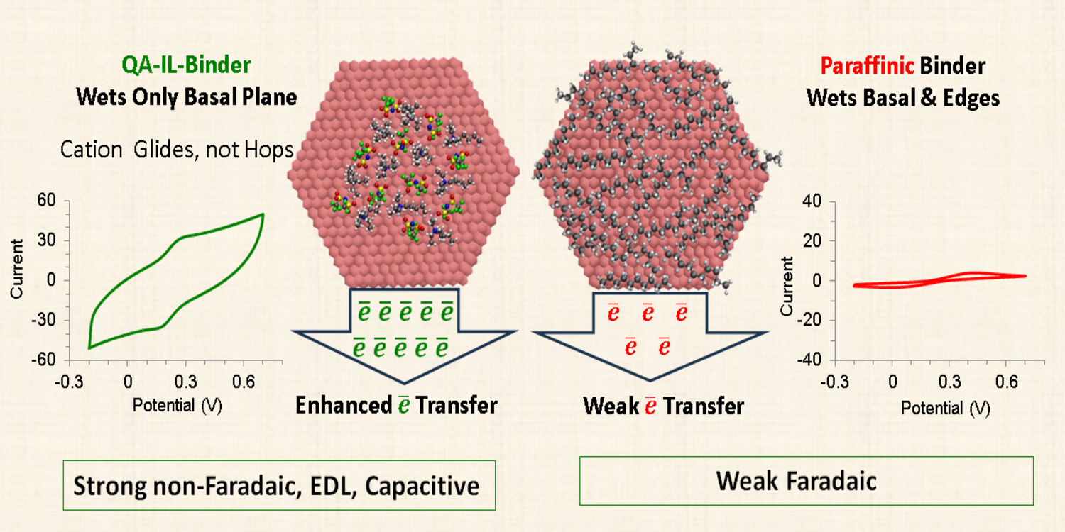 Our results highlight a dual role of QA-based ionic liquid binders. (1) Structural role: by selectively wetting basal planes and leaving edge planes exposed, they enhance electron transfer. (2) Dynamic role: their flexible ions organize and move efficiently at the graphite interface, supporting rapid charge accumulation.