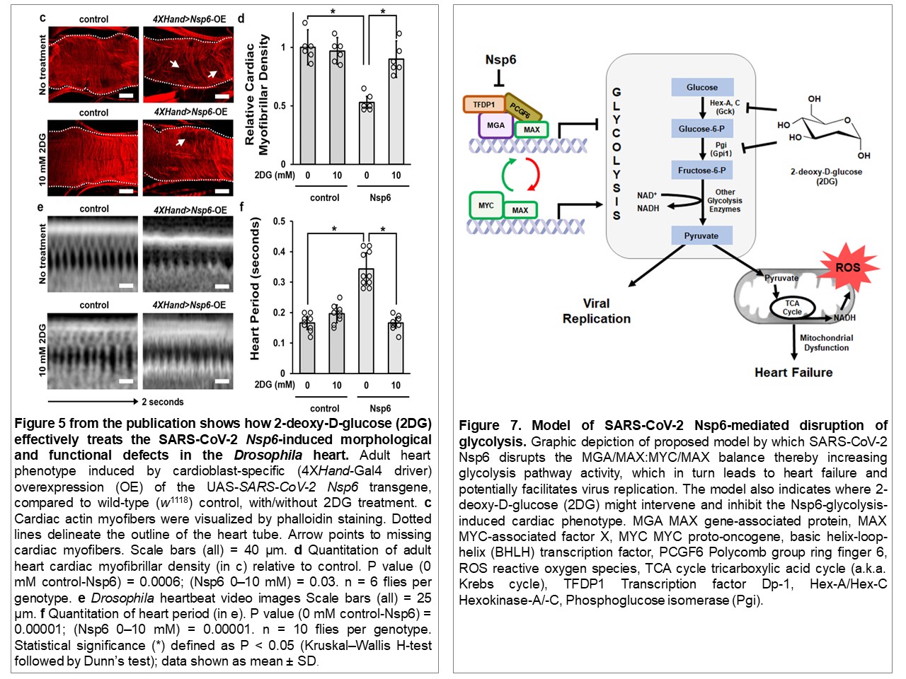 First, we set out to identify the SARS-CoV-2 encoded proteins that are most likely pathogenic. The SARS-CoV-2 proteins were prioritized based on toxicity and cellular localization mammalian cells, along with their predicted topology and data from UniProt Knowledgebase. We then generated flies that expressed the most promising proteins ubiquitously. These studies identified four highly pathogenic SARS-CoV-2 proteins; Orf6, Nsp6, Orf3a and Orf7a. The findings and the mechanism underlying Orf6 pathogenicity are described in previous publications (Lee et al. 2021, Cell Biosci.; Zhu et al. 2021, Cell Biosci.). In our latest manuscript we focus on the pathomechanisms of Nsp6, whose expression is highly damaging to the heart. This is of particular interest, as cardiovascular complications are common in patients with COVID-19, and cardiovascular damage has been observed following SARS-CoV-2 infection even in those who remain asymptomatic. In addition, SARS-CoV-2 has been detected in cardiac tissue of patients with COVID-19, suggestion the complications are a direct effect of infection. Notably, the fly has a lengthy and strong track record in modeling heart development and diseases; a major research interest at our Center for Precision Disease Modeling (CPDM). By expressing SARS-CoV-2 Nsp6 specifically in the fly heart we found that Nsp6 induced both structural (disorganized actin filaments and reduced muscle fiber density) and functional (reduced diastolic, but not systolic, diameter of the heart tube; lengthened heart period) defects. We then used proteomics in human cells (HEK 293T) to identify which host proteins can interact with Nsp6, this implicated components of the MGA/MAX complex (MGA, PCGF6 and TFDP1). This complex forms a delicately balanced system with MYC/MAX in regulating the activity of the glycolysis pathway. Complementary transcriptomic data from the fly heart, revealed that Nsp6 binding of the MGA/MAX complex shifts the balance towards MYC/MAX which results in increased glycolysis pathway activity. Additional findings in the flies showed that the Nsp6-induced glycolysis disrupts the function of cardiac mitochondria. Dysfunctional cardiac mitochondria have previously been associated with increased reactive oxygen species (ROS) during heart failure. Altogether, providing a pathomechanism that might explain COVID-19-associated cardiac complications. Furthermore, we found that by inhibiting the glycolysis pathways, using 2-deoxy-D-glucose (2DG) treatment, the Nsp6-induced cardiac pathology in flies could be reduced. To bridge the gap between findings in fly and humans, we validated these findings (pathway affected, phenotype, and 2DG treatment) in mouse primary cardiomyocytes. Currently, several clinical trials using 2DG to treat COVID-19 are ongoing. Moreover, 2DG has received emergency use authorization in India to curb a devastating recent outbreak of COVID-19 (https://pib.gov.in/PressReleasePage.aspx?PRID=1717007).