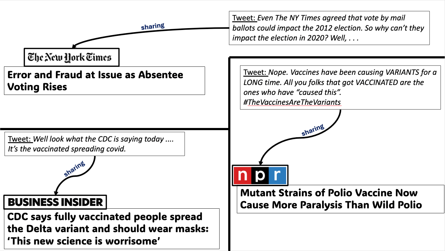 As researchers interested in circulation of news on social media and the challenge of misinformation spread online, there were several puzzling things we observed anecdotally that we felt called to study. One of the puzzles was how empirical studies quantifying spread of misinformation or ‘fake news’ on social media seemed to conclude that misinformation is a very small part of people’s media diet, and yet, several studies also outlined the harms and negative impact of misinformation spread in a variety of domains. Another puzzle was how misinformation sharers on social media do not exclusively share ‘fake’ news or news from domains known to be unreliable; rather, they also share ‘mainstream’ news where the sources are reputable or considered reliable. These puzzles interacted with some mainstream reporting in 2020 and 2021 on the COVID-19 pandemic which would draw a collective groan from us. Articles such as the one from the Washington Post with the original headline: “Vaccinated people now make up a majority of covid deaths” (the headline was changed 3 days later, but it was already notoriously popular on Twitter/X amongst the anti-vax community), or the one from Chicago Tribute titled “A ‘healthy’ doctor died two weeks after getting a COVID-19 vaccine; CDC is investigating why”, were obvious ammunition for folks who shared misinformation surrounding the efficacy and safety of vaccines, and arguably carried more legitimacy and potential reach (as demonstrated by case studies in our paper). But these articles would not be typically considered in much of misinformation research because of the domains publishing these articles!