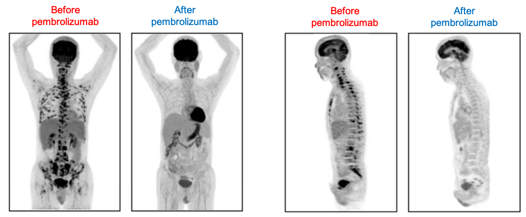 In April 2016, after failing an additional 4 lines of salvage therapies, his condition took a nose-dive with evidence of multi-organ failure and severe pancytopenia. As his high-risk clinical condition precluded him from enrolling in any clinical trial, an off-label infusion of pembrolizumab at 200 mg was initiated in May 2016. Interestingly, 1 week after the infusion, he began to show gradual clinical improvement and 2 weeks subsequently, his liver derangements were completely normalized, and his pancytopenia had improved remarkably. The patient achieved complete response with PET-CT scans showing undetectable hypermetabolic foci 8 weeks after the first administered dose of pembrolizumab (Fig. 2). It is heartening to learn that the patient is still in complete remission at the time of this writing.