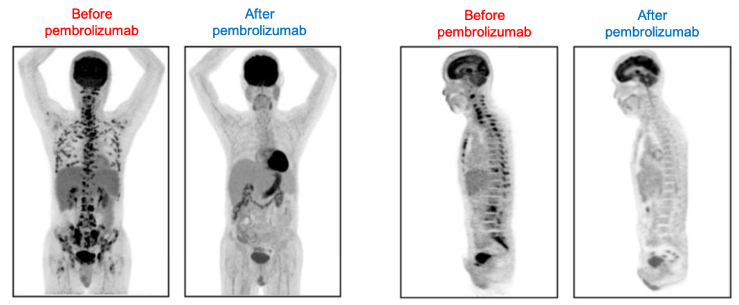 In April 2016, after failing an additional 4 lines of salvage therapies, his condition took a nose-dive with evidence of multi-organ failure and severe pancytopenia. As his high-risk clinical condition precluded him from enrolling in any clinical trial, an off-label infusion of pembrolizumab at 200 mg was initiated in May 2016. Interestingly, 1 week after the infusion, he began to show gradual clinical improvement and 2 weeks subsequently, his liver derangements were completely normalized, and his pancytopenia had improved remarkably. The patient achieved complete response with PET-CT scans showing undetectable hypermetabolic foci 8 weeks after the first administered dose of pembrolizumab (Fig. 2). It is heartening to learn that the patient is still in complete remission at the time of this writing.