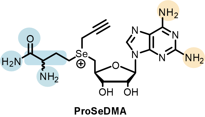 In the SAMURI crystal model, every nucleotide in the catalytic core affords one or more functional roles to stabilize the overall architecture or to facilitate the correct orientation of active center, except for two nucleotides, A7 and U8, which do not interact with any nearby residues. These nucleotides were initially termed “spacer” and considered to merely provide sufficient space rather than directly participate in the catalysis. Yet chemical structure probing and ribozyme mutagenesis experiments suggested a potential interaction between U8 and the cofactor. To identify the U8 interacting partners in the cofactor, we synthesized a series of cofactor “mutants” (Figure 3), examined their influence on SAMURI catalysis, and finally successfully pinpointed the α-amino group in the methionine unit as the most likely hidden interactor with U8. Taken together, what was initially considered a “nonessential” spacer nucleotide turned out to be an activity booster. Another surprising discovery in the cofactor campaign was a cofactor variant ProSeDM, which lacks the entire methionine unit but still served as an alkyl donor. For more detailed biochemical characterization and the discussion of ProSeDM, please visit our paper.