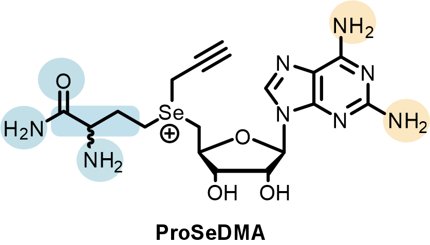 In the SAMURI crystal model, every nucleotide in the catalytic core affords one or more functional roles to stabilize the overall architecture or to facilitate the correct orientation of active center, except for two nucleotides, A7 and U8, which do not interact with any nearby residues. These nucleotides were initially termed “spacer” and considered to merely provide sufficient space rather than directly participate in the catalysis. Yet chemical structure probing and ribozyme mutagenesis experiments suggested a potential interaction between U8 and the cofactor. To identify the U8 interacting partners in the cofactor, we synthesized a series of cofactor “mutants” (Figure 3), examined their influence on SAMURI catalysis, and finally successfully pinpointed the α-amino group in the methionine unit as the most likely hidden interactor with U8. Taken together, what was initially considered a “nonessential” spacer nucleotide turned out to be an activity booster. Another surprising discovery in the cofactor campaign was a cofactor variant ProSeDM, which lacks the entire methionine unit but still served as an alkyl donor. For more detailed biochemical characterization and the discussion of ProSeDM, please visit our paper.