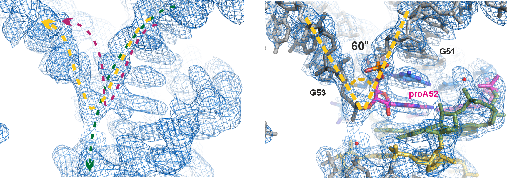 Figure 2. The unexpected kink at the active site. Left panel: electron density map of the final model, zoomed-in near the active site (contoured at 1σ); the dashed lines depict three possible paths of the RNA chain, with the yellow line representing the final model. Right panel: final model built into the electron density map. Instead of the usual linear twist of A-form helical structures, the active site adopts a 60o sharp turn (kink) within a 3-nt long stretch (G51-proA52-G53).