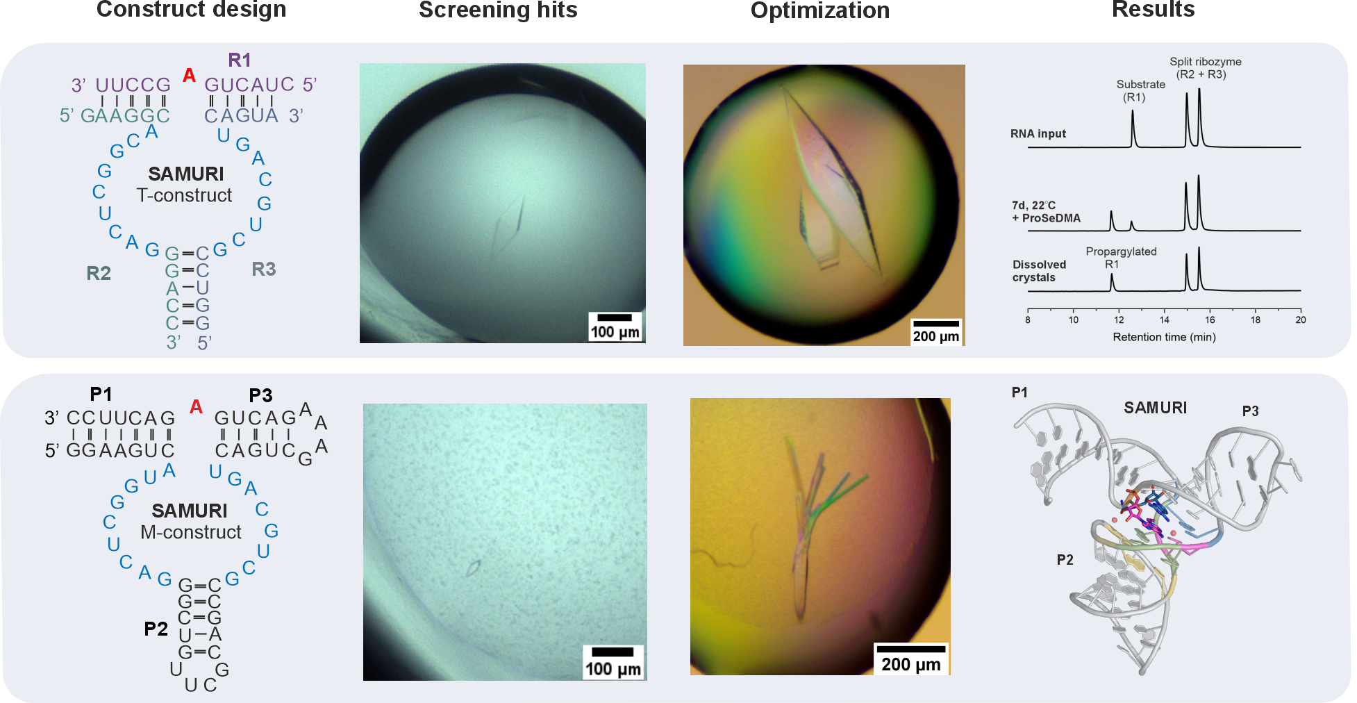 Obtaining well-diffractive crystals is the biggest hurdle for most macromolecules – this is especially true for RNAs due to their negatively charged backbone and the limited intermolecular interactions which are required for the formation of crystals. After extensive crystallization trials, two potential candidates emerged: a trimolecular (T) construct and a monomolecular (M) construct (Figure 1). While the T-construct readily grew huge, beautiful crystals, the M-construct formed tiny, diamond-shaped crystals that were difficult to reproduce. Based on the crystal morphology and our previous success in determining the MTR1 structure,4 we initially focused most of our efforts on improving the T-construct, with only minor attention given to the M-construct. The diffraction experiments, however, revealed their true quality that had been disguised. After optimization of both constructs, the M-construct eventually resulted in the final structure at a resolution of 2.9 Å, while the gorgeous-looking crystals from T-construct remained poorly diffracting. Nevertheless, the time invested on the T-construct was not spent in vain. It allowed us to characterize the crystal contents, which wasn’t possible for the M-construct. Anion exchange chromatography revealed a preference for the post-catalytic state in the SAMURI crystals, despite the presence of over 30% unmodified species in the crystallization drop. Similar results for the M-construct were obtained indirectly via gel-shift assays, as shown in the paper.5