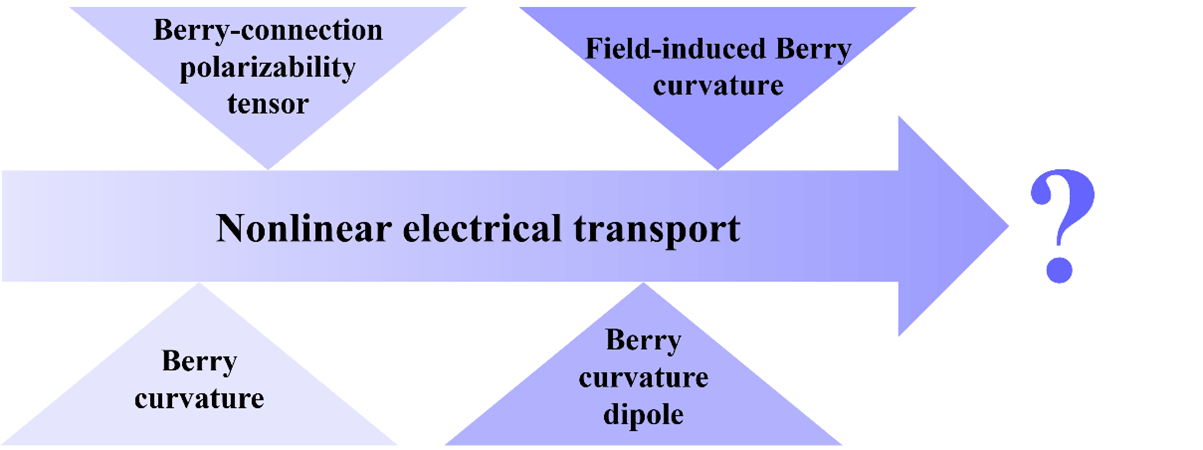 Speculations on the future of nonlinear electrical transport study: the current so-called “nonlinear electronics” refers to the nonlinear electronic device circuits and their macroscopic electrical behavior, which is essentially different from the microcosmic nonlinear response of electrons like the nonlinear Hall effect. I would rather compare the nonlinear Hall effect and the nonlinear electrical transport mechanism to nonlinear optics, which focuses on the nonlinear response of light and is also closely related to the symmetry of the system. The second- and third-order nonlinear Hall effect provide a way to probe Berry curvature and Berry-connection polarizability tensor, which enables people in real space to manipulate properties in momentum space. If we could already reveal such interesting physics up to third-order response, I believe more opportunities are awaiting in higher-order responses, and the study of diverse nonlinear electrical transport properties could finally converge to an individual branch of physics, just like nonlinear optics.