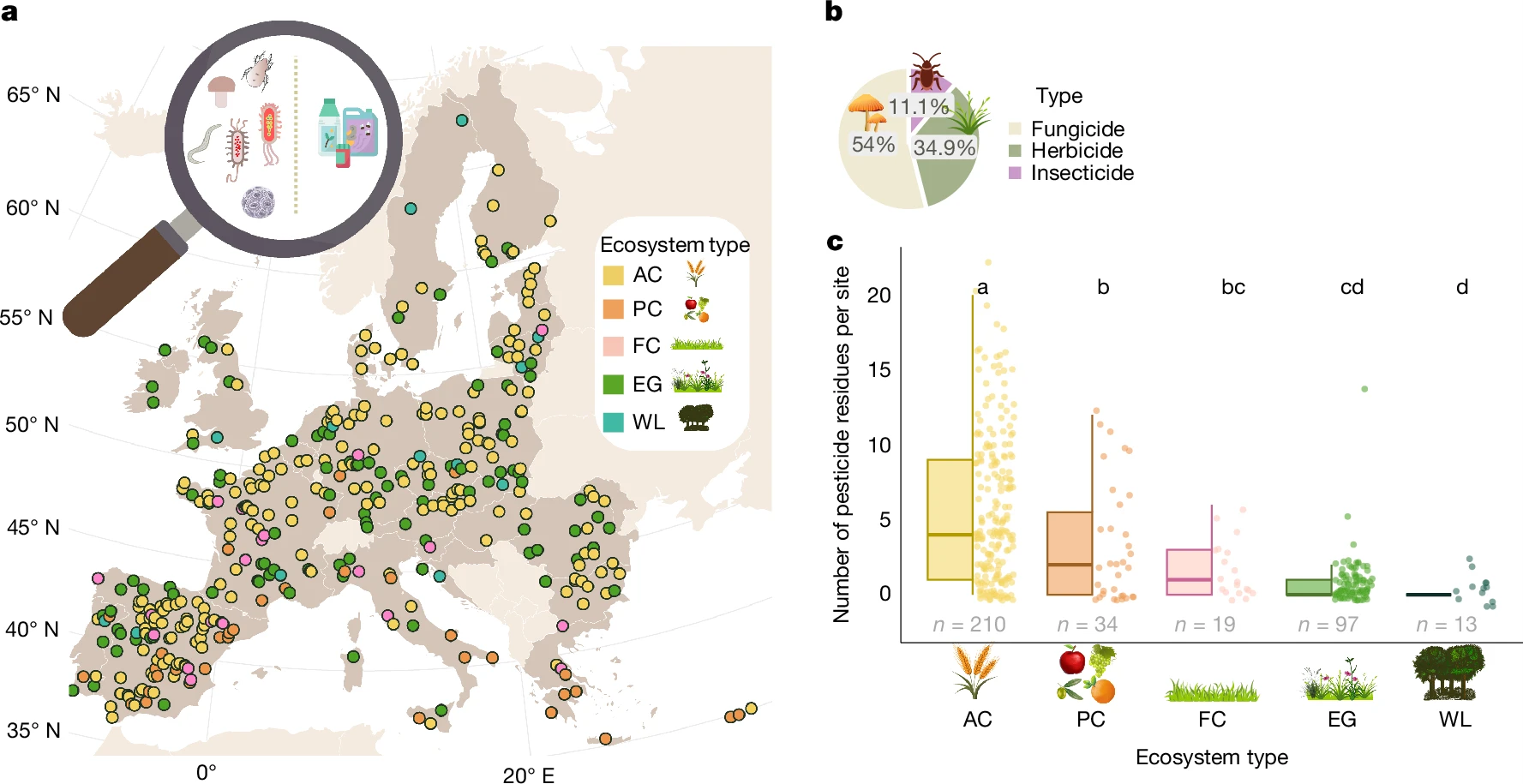 We especially accounted for a number of key environmental drivers, such as soil properties, climate, and ecosystem type, allowing us to evaluate the relative importance of pesticide residues compared to other abiotic factors in shaping soil biodiversity. This is the first study of this extent, and the first to include not only croplands but also grasslands and woodlands.