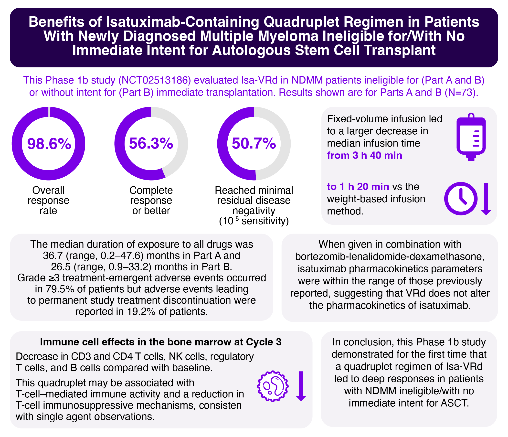 In our Phase 1b study, we evaluated the preliminary efficacy, safety, and pharmacokinetics (PK) of the quadruplet regimen of the anti-CD38 monoclonal antibody isatuximab combined with VRd (Isa-VRd) in transplant-ineligible patients with NDMM (Part A cohort). In the Isa-VRd Part B cohort, patients with no intent for immediate transplant were also included.