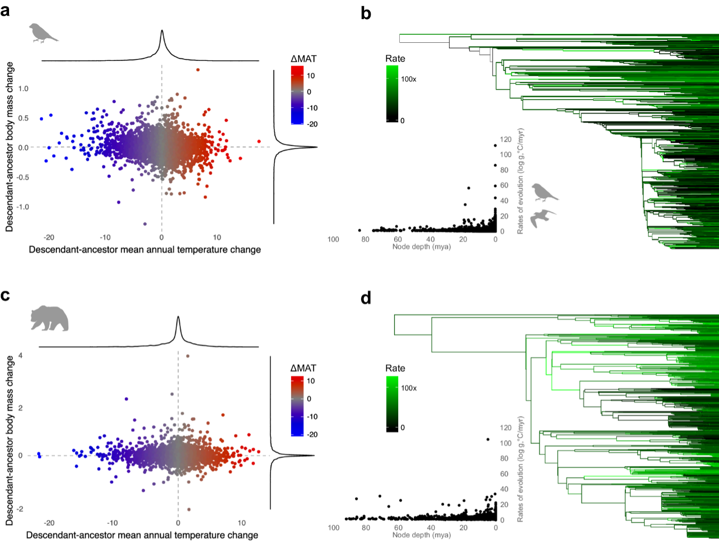 Figure 4. a,c, Estimated changes in body size as a function of mean annual temperature along branches of the extant bird and mammal phylogenies (b,d). A trend from upper left to lower right would be consistent with Bergmann’s rule. Point colour reflects estimated changes in MAT. Phylogenetic branches are coloured by the rate of body size evolution, after accounting for changes in temperature. Birds are represented by the Geospiza silhouette (Ryan Cubo; CC0 1.0 license) and mammals by the Ursus arctos silhouette (Tracy Heath; CC0 1.0).