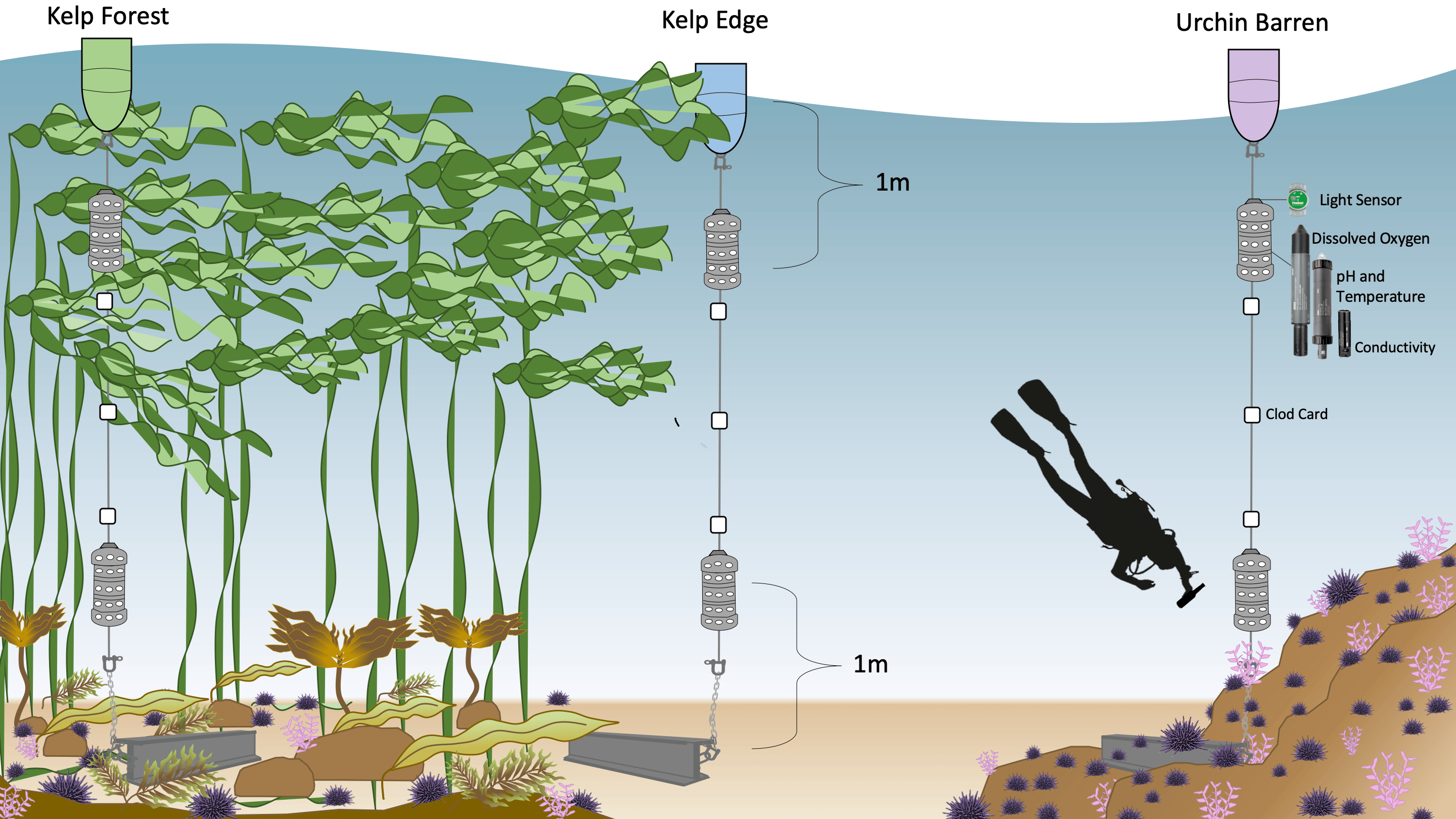 The kelp forests in Washington were huge (~100 hectares) and intact, but kelp forests around the world were in decline (Wernberg et al. 2019), and northern California kelp forests were a perfect example, with a “perfect storm” of multiple stressors causing dramatic canopy reductions and leaving behind a landscape of tiny fragmented patches. My new question was clear: do these tiny kelp patches retain their ability to modify local seawater chemistry to the same degree as large, intact forests? So, with some minor tweaks to our original design, we deployed our sensors in mid-July.