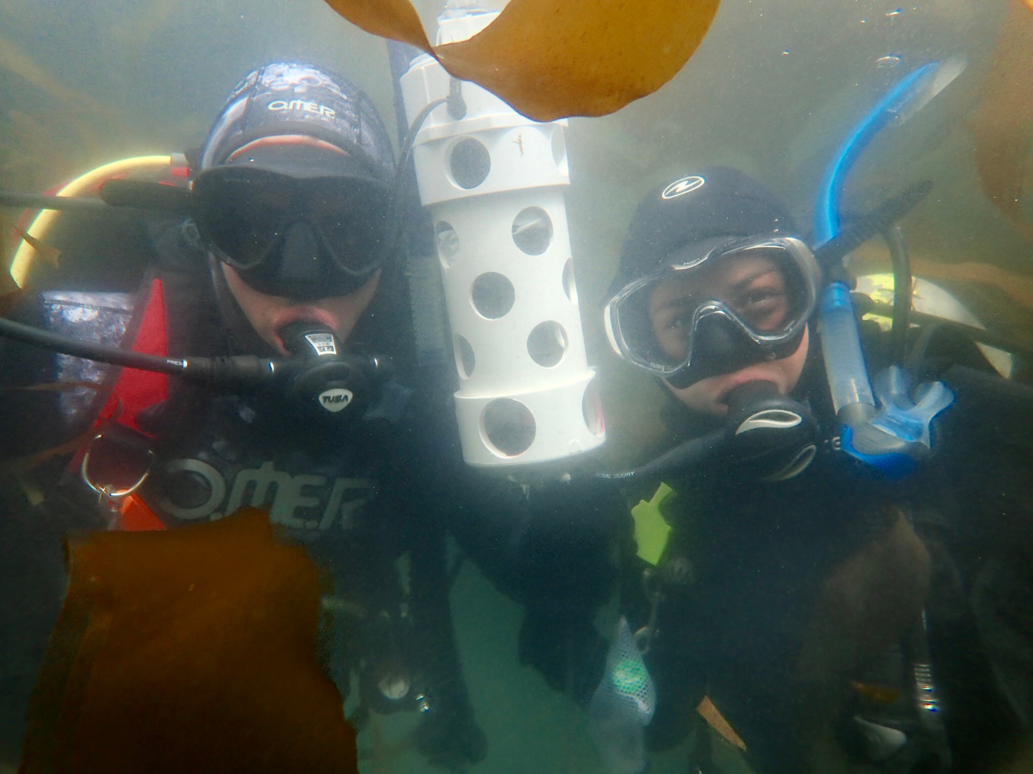 Research assistants Jeremy McFarland and Mahallelah Shauer help to install seawater sensors in the bull kelp canopy.