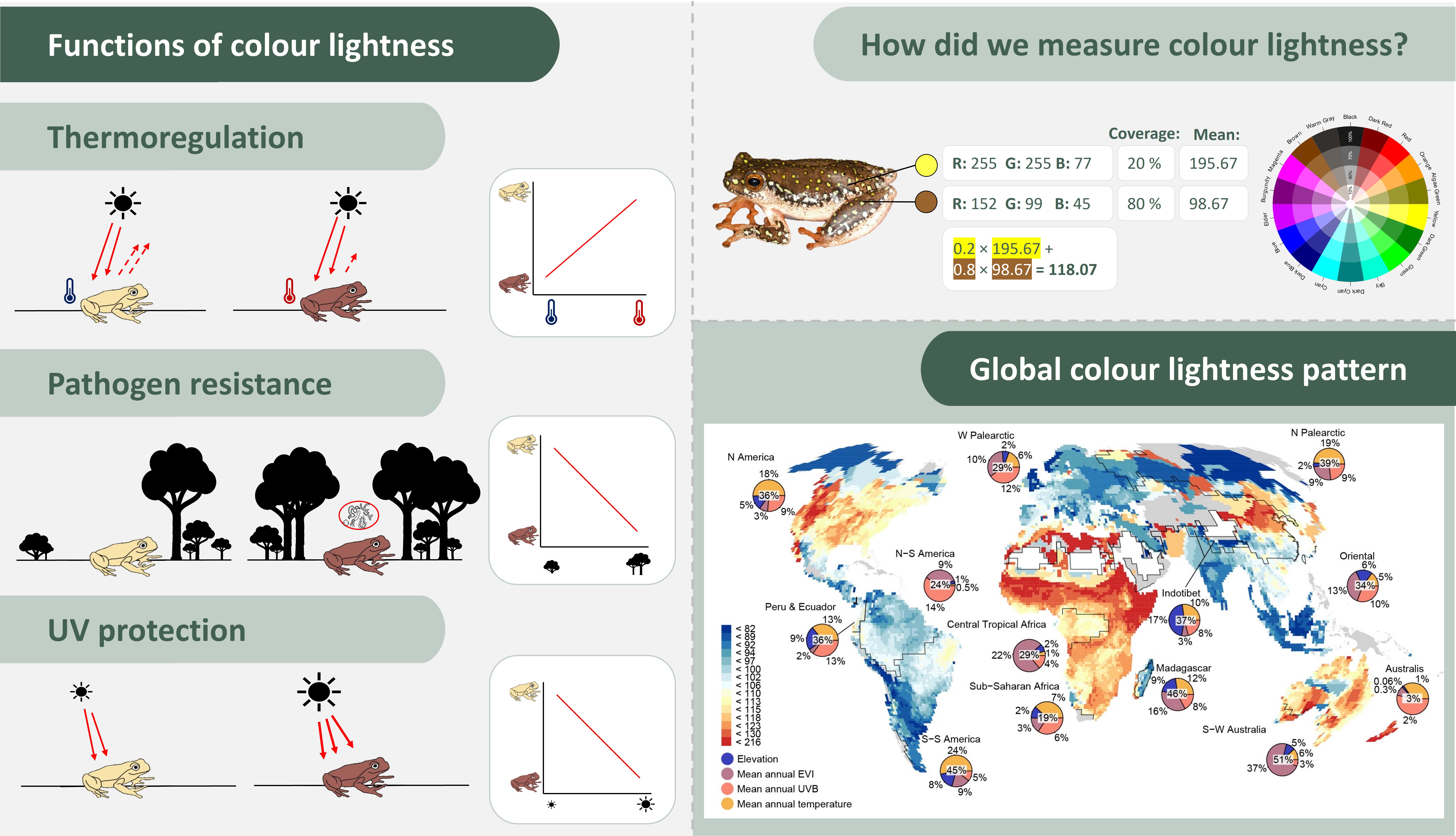 Beyond camouflage and aposematism, colour and particularly the melanisation measured as lightness plays a crucial role in regulating the body temperature. Colour-based thermoregulation is increasingly supported for insect groups, which, like anurans, depend on absorbing sunlight to heat up and maintain their body temperature. The relationship between colour lightness, physiology and distribution is conceptualized in the thermal melanism hypothesis stating that darker coloured organisms are favoured to live in colder regions as they heat up faster, whereas lighter coloured ones benefit from the prevention of overheating in warmer regions. In addition, a darker skin can enhance the protection of detrimental UVB radiation and the tougher walls of melanised skin cells can provide an advantage against the penetration by bacteria and fungi (Figure 2). However, our current knowledge of the ecological importance of colour lightness is mainly based on studies in colder areas such as Europe and North America and the physiological implications of colour variation in anurans remained thus far unexplored.