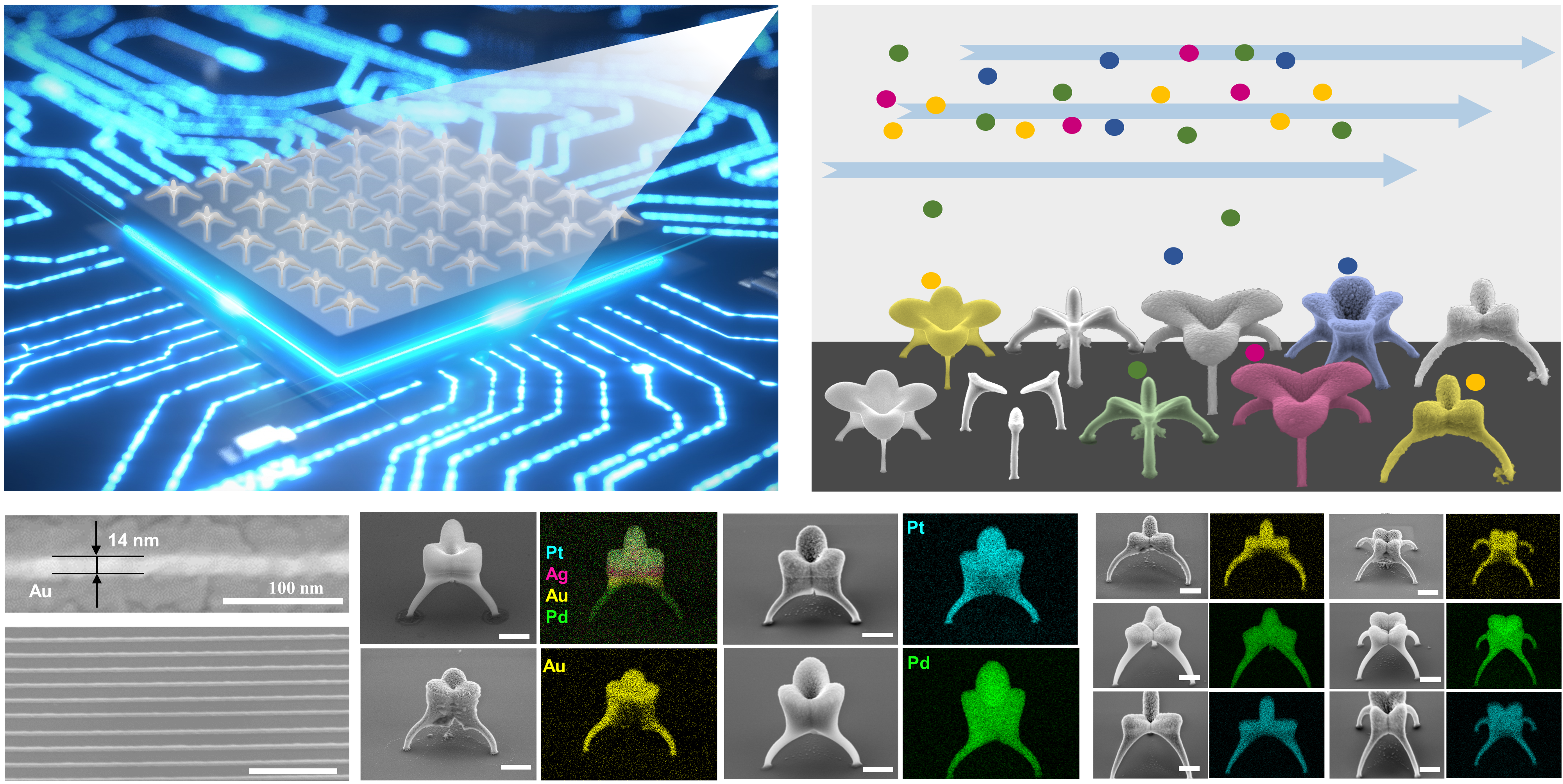 Our 3D nanoprinting results from tireless innovation and relentless pursuit of precision. It opens up the vast potential of multimaterials printing, which was largely elusive until now. Adjusting electric and flow fields provides a high degree of flexibility in materials―from single metals to alloys and multimaterials. Even more exciting, we can now tailor the optical properties of the printed nanoarchitectures by adjusting the material, geometry, feature size, and array periodicity.