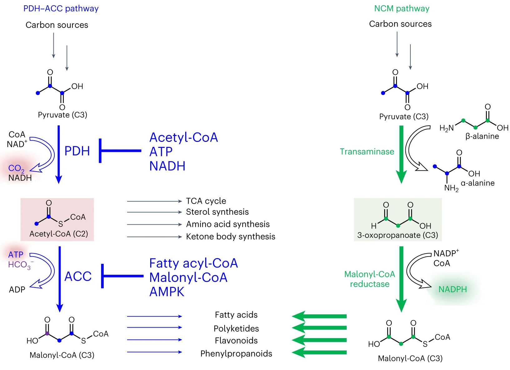 Fig. 1 The natural pathway (PDH-ACC) and NCM pathway for malonyl-CoA biosynthesis.