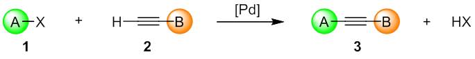 Figure 1. The Sonogashira reaction: alkynylation of aryl halide 1 with acetylene 2 into internal acetylene 3.