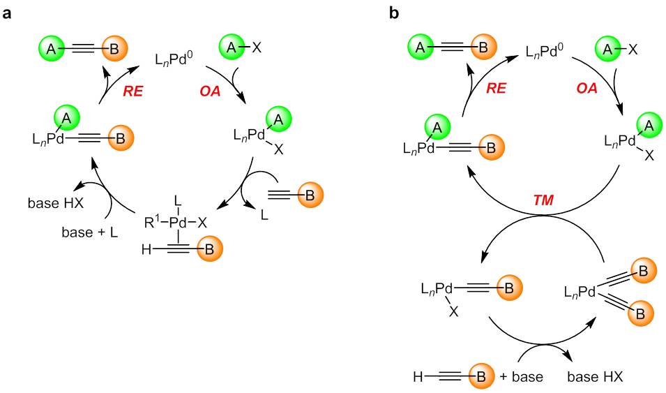 Figure 3. a: The textbook mechanism for a copper-free Sonogashira reaction; b: our mechanistic proposal for the copper-free Sonogashira reaction. OA=oxidative addition, TM=transmetallation, RE=reductive elimination.