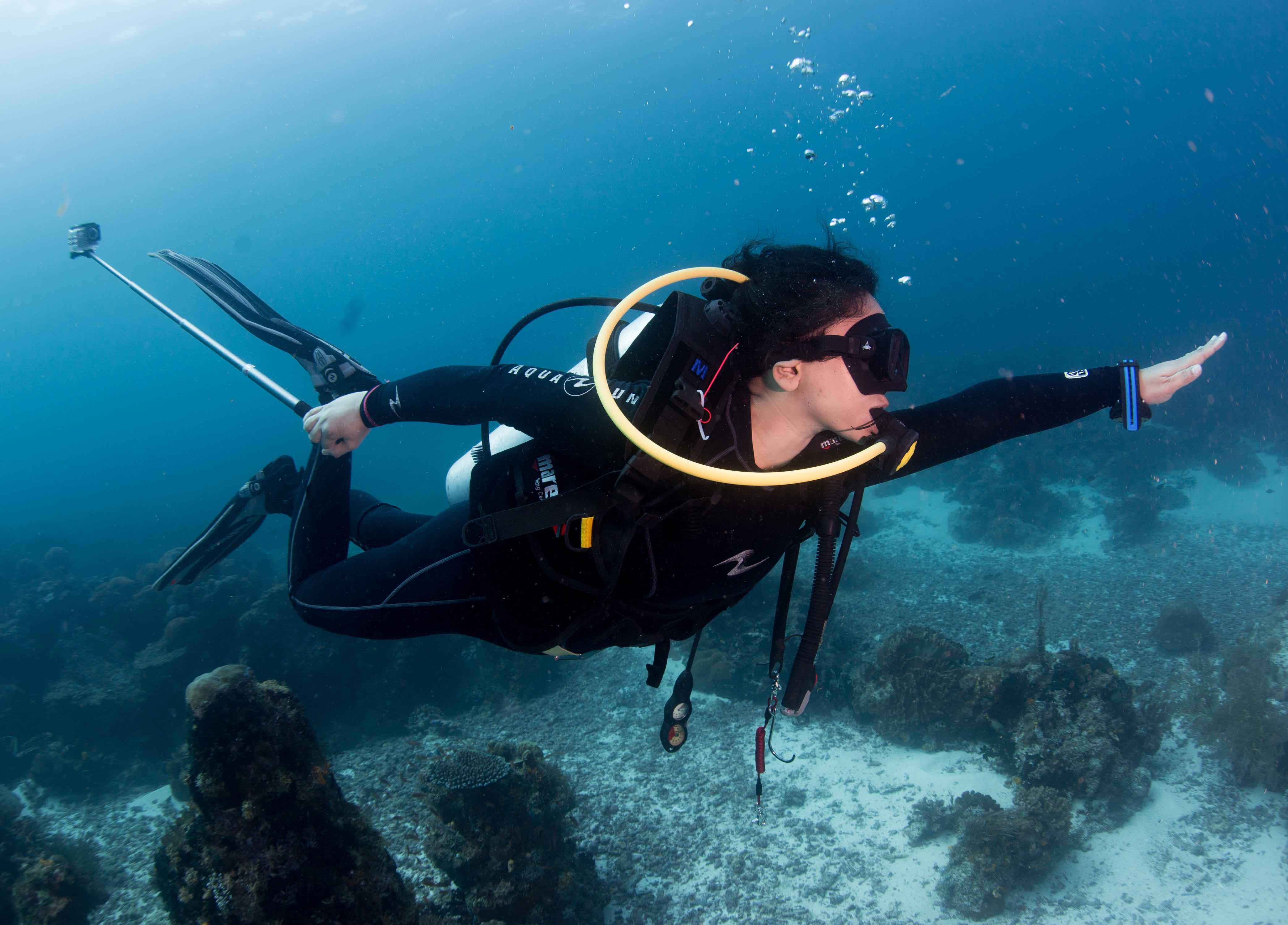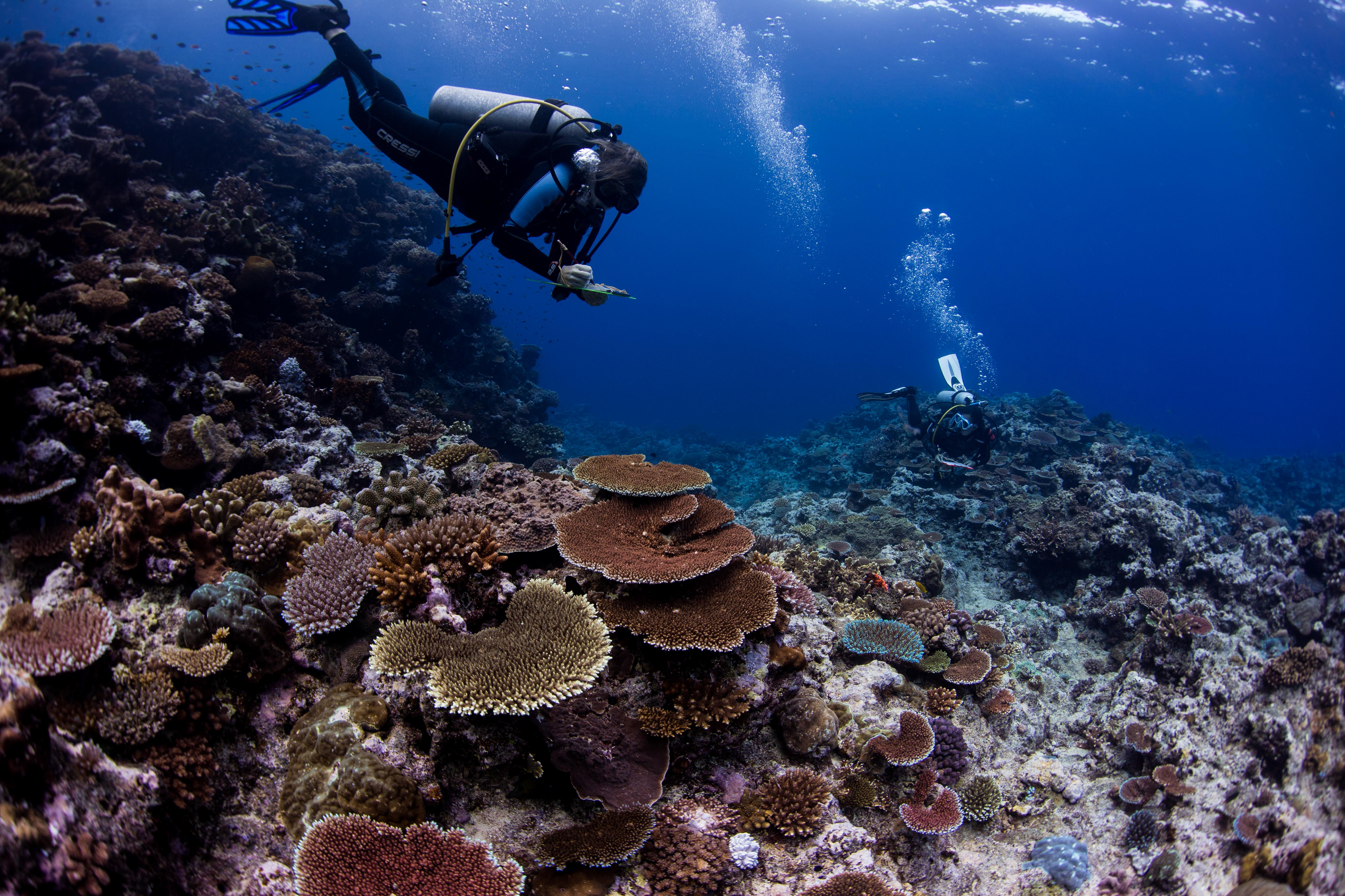 Photo captions. Top: Shinta Pardede, WCS Indonesia marine scientist and coauthor, on a coral reef survey dive in Indonesia. Bottom: Dr Sangeeta Mangubhai and Dr Stacy Jupiter of WCS Melanesia survey coral reef communities in Fiji. Photos: Emily Darling/WCS.
