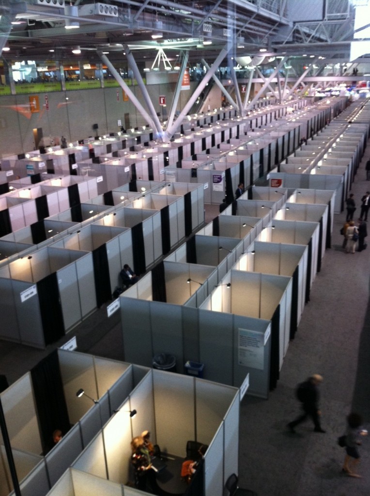 Day 1 of BIO Convention. The picture is from above the business partnering section of the conference, located alongside the exhibit hall. Scores of rooms, and plenty of people putting them to use. BIO offers many things – panel sessions, keynote speakers, receptions for mingling and, this year, the sights of Boston. But much of the lasting benefit of BIO comes from those meeting rooms, where the drug discovery partnerships of tomorrow often begin.