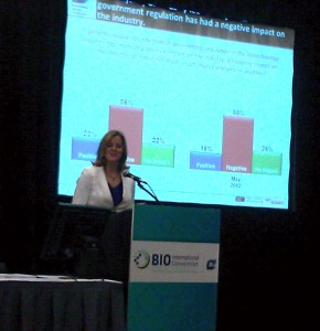 At a press conference Tuesday morning, BIO announced the results of three surveys that showed a continuing optimism about the state of the biotech industry, from industry leaders, US voters and BIO 2012 attendees. Geoff Garin of Hart Research Associates summarized the outlook among industry leaders: 63% are still optimistic about biotech’s future prospects, compared with 79% when the same question was asked in April 2007. Leaders cited the difficulty in attracting private financing as well as the lack of tax incentives from government as their main challenges. As might be suspected, convention attendees were even more optimistic about the state of their industry, with finding cures for chronic diseases such as cancer, Alzheimer’s Parkinson’s, HIV/AIDS and diabetes, and improving the economy being the most important drivers.