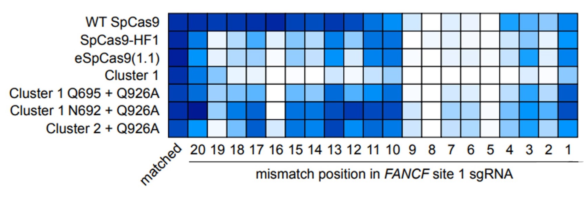 The researchers then applied this knowledge of the submolecular dynamics of Cas9 to design a Cas9 variant with superior accuracy. They generated multiple Cas9 variants bearing alanine substitutions in five amino-acid clusters at the DNA/RNA duplex interface of Cas9, four of which are located in REC3 (the remaining one is in the L2 domain). The Cas9 with the substitutions in Cluster 1 (named HypaCas9) was selected for its superior accuracy, as it showed reduced off-target cleavage rates while maintaining high on-target activity when compared with SpCas9-HF1 and eSpCas9(1.1) (Figure 2).