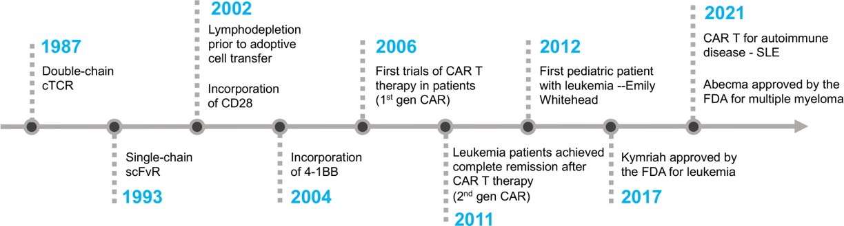 Figure 2: The timeline of key milestones accomplished during the development of CAR-T cell therapy [Mitra A. et al. 2023].
