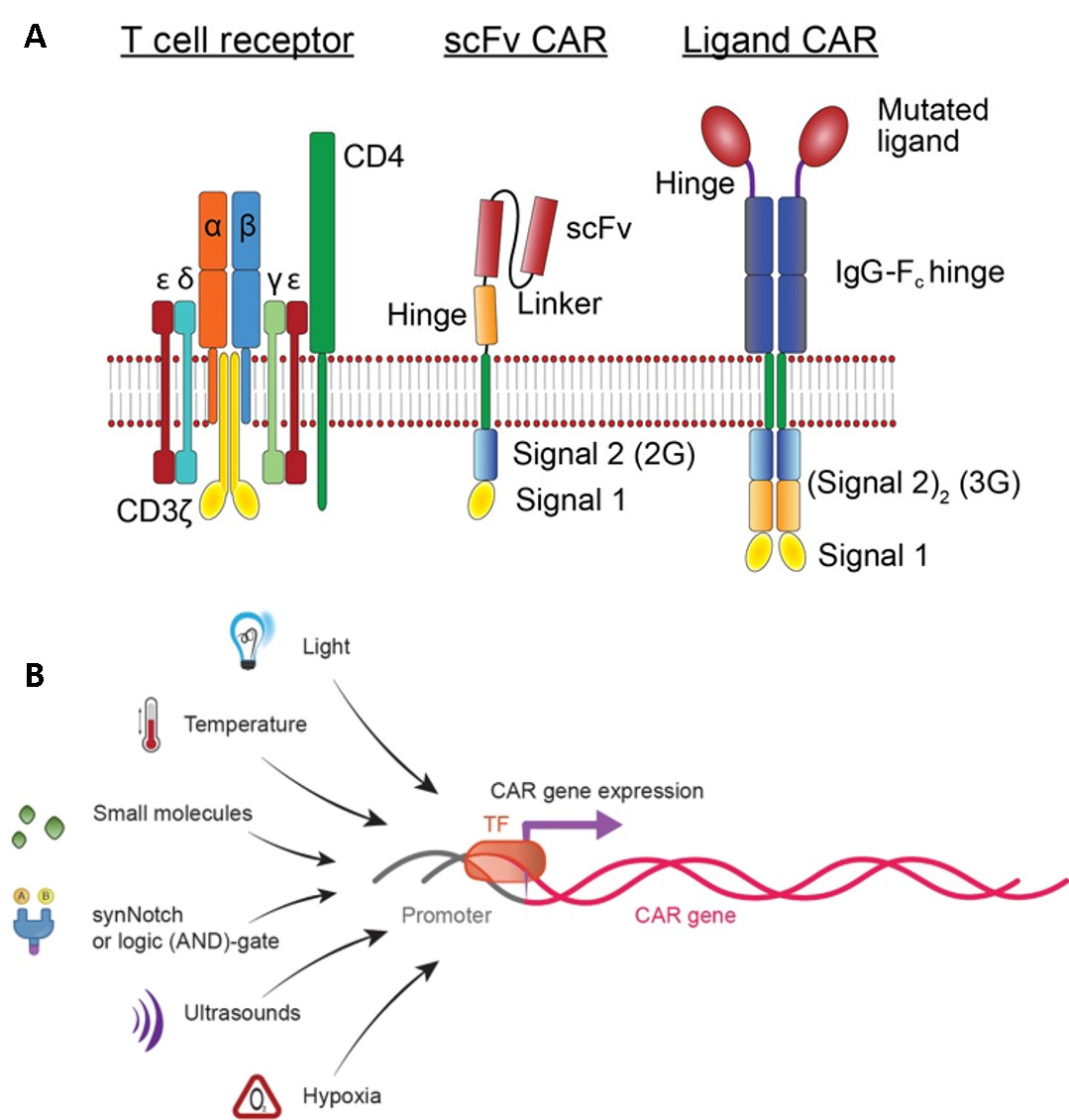 In a similar method, the genetic transfer of CAR mRNA can be achieved through many approaches, including ultrasound activation, hypoxia, temperature and light regulation, small molecules as well as logic (AND)-gate mechanisms of synthetic biology (Figure 11) [Celichowski P. et al. 2023]. Early CARs contained antibody single chain variable fragments (scFvs) fused through a transmembrane domain to the cytoplasmic tail of the TCR signaling component CD3ζ signaling domain, which includes both Kymriah and Yescarta drugs as well as a variety of clinically used second generation CARs (Figure 6) [Lindner S. et al. 2018, Yun K. et al. 2023]. Each additional next-generation CAR constructs add further signaling capacity to the engineered receptors for greater efficacy, for off-the-shelf products (Figure 11) [Labanieh L. et al. 2018].
