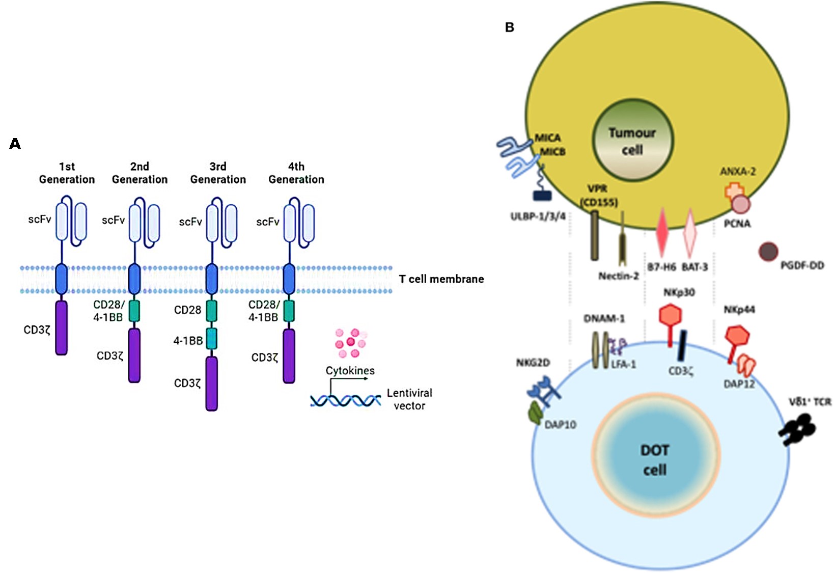 The possibility of combining the two strategies (CAR-NK, and CAR-T) affords a more promising mechanism for potential therapies. Proof-of-concept studies have shown how CAR-NK cells generated from pediatric neuroblastoma patients successfully eliminated the autologous MDSCs that typically suppress CAR-T cells in the tumor microenvironment [Feng S. et al. 2018]. Innovations that combine NK and T cells, show the possibility of establishing a pre-clinical proof-of-concept new cellular product known as delta one T cells (DOT) that are derived from γδ T cells for adoptive immunotherapy of cancer [Santos-Silva B. and Strid J. 2018]. DOT cells can upregulate NKG2D levels too, to induce the de novo expression of NK protein receptors that are associated with anti-tumor and anti-viral functions (Figure 6).