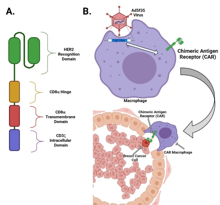 The process of gene transfer into human macrophages as a method of CAR delivery is a long-standing challenge [Fleetwood A. et al. 2007]. Efforts to facilitate this process include using the expression of the cluster differentiation 46 (CD46) membrane cofactor protein, to functionalize protein molecules as a docking protein for group B adenoviruses, such as Ad35 to engineer a replication-incompetent chimeric adenoviral vector (Ad5f35), to deliver CAR to macrophages [Nilsson M. et al. 2004]. Recent studies have further demonstrated how anti-HER2 CAR could be engineered into an adenoviral vector (Ad5f35) to test its principle-of-action, to demonstrate that vector-transduced human macrophages expressed CAR efficiently. The primary anti-HER2-CAR-Macrophages can effectively phagocytose HER2+ tumor cells and eradicate a HER2+ ovarian cancer cell line (SKOV3), in a dose- and time-dependent manner. Again, the level of tumor phagocytosis correlates with the level of CAR expression. Meanwhile, on-target/off-tumor toxicity assays showed how normal cells were not phagocytosed by the anti-HER2-CAR-Macrophages, in mice [Klichinsky M. et al. 2020].