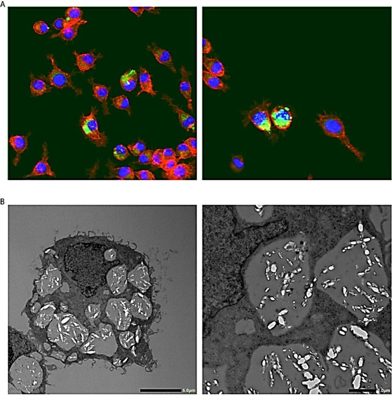 Figure 8: Calcium oxalate crystal phagocytosis by macrophages. A) Fluorescent immunohistochemical staining of macrophages cultured with calcium oxalate monohydrate crystals. Red – phalloidin, Green – calcium oxalate monohydrate crystals, Blue – nucleus. Magnification 400 X. B) Transmission electron microscopy images of macrophages that engulf calcium oxalate monohydrate crystals [Taguchi K. et al. 2021].