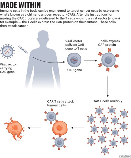 - Ledford H. Cancer-fighting CAR T cells could be made inside body with viral injection, Nature, 2023