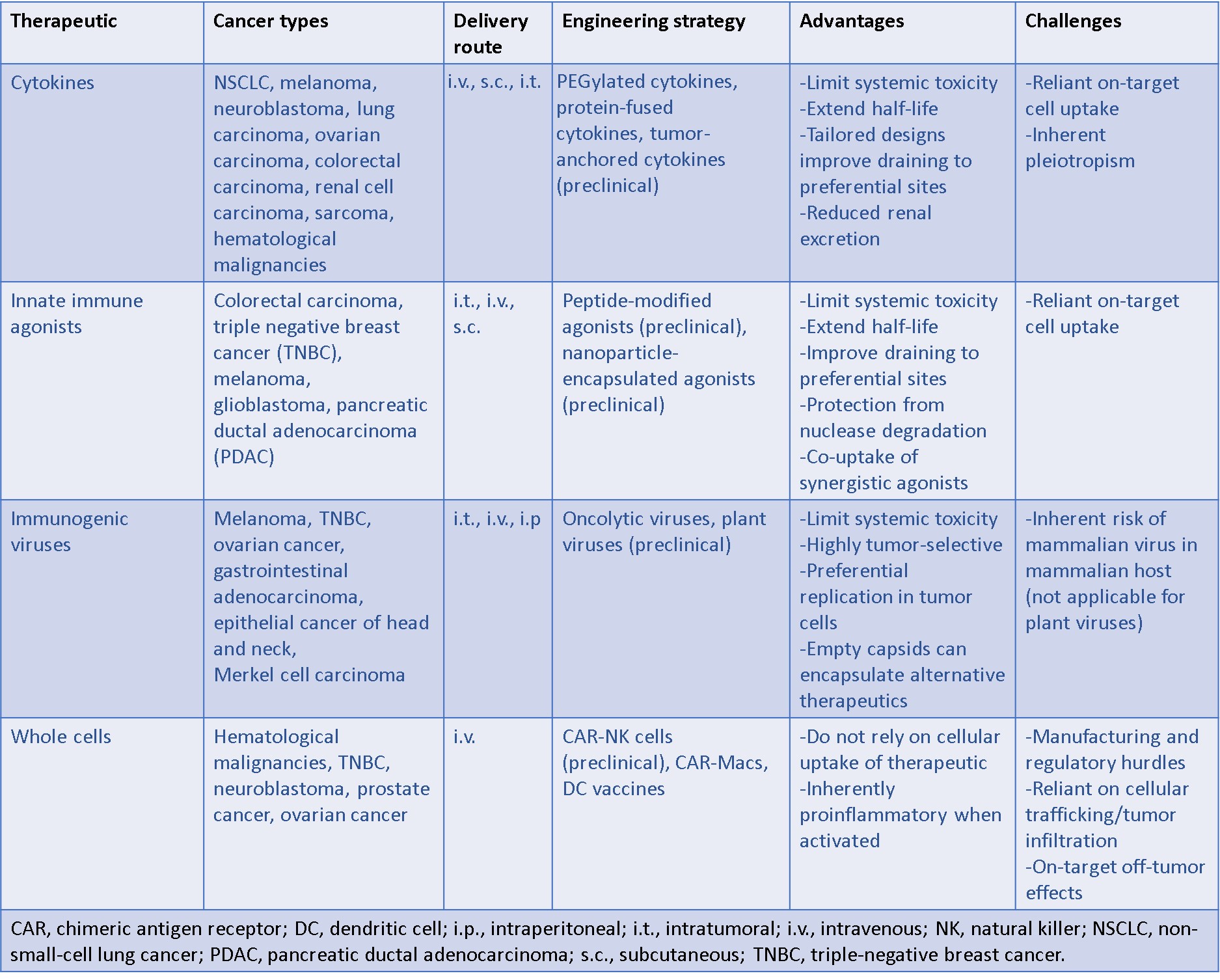 Large-scale cell-based approaches focus on the development of pro-inflammatory chimeric antigen receptors to bioengineer innate immune cells such as natural killer cells, and macrophages due to their significant potential for tumor microenvironment remodeling [Kane G. et al. 2023]. In addition to CAR T-based therapies, dendritic cells are also better suited as cell-based therapies since they can harness the professional antigen-presenting function during cancer vaccination [Wang Y. 2020]. Nevertheless, the technology must overcome significant manufacturing and regulatory challenges before their wide-spread applications in the clinic [Heathman T. et al. 2015]. These therapies are, however, limited since they rely on cellular trafficking and tumor infiltration, with CAR cells sometimes exhibiting off-target effects that can cause systemic inflammation [Sterner R. et al. 2021].