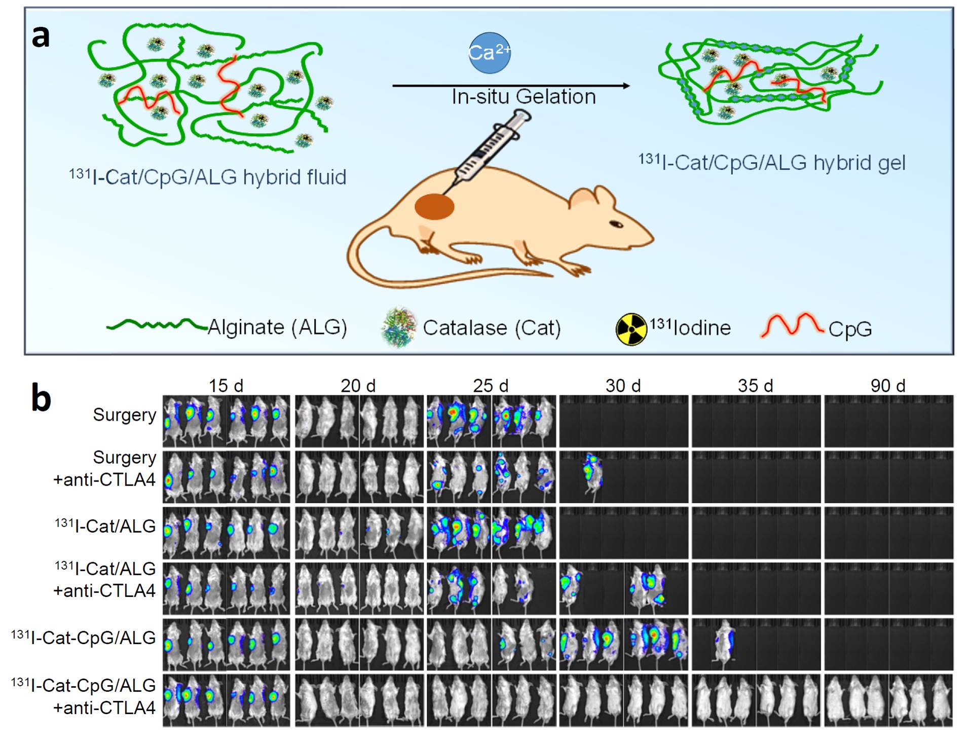 Figure 1. (a) A scheme illustrating in situ gelation of the 131I-Cat/CpG/ALG hybrid fluid after local injection into tumors. (b) In vivo bioluminescence images to track cancer metastases in different groups of mice after various treatments to eliminate their primary orthotopic 4T1 breast tumors. After local elimination of primary tumors with 131I-Cat/CpG/ALG, the generated immune responses together with CTLA4 blockade could effective inhibit tumor metastases. Figures adapted from ref. 5. Springer Nature.